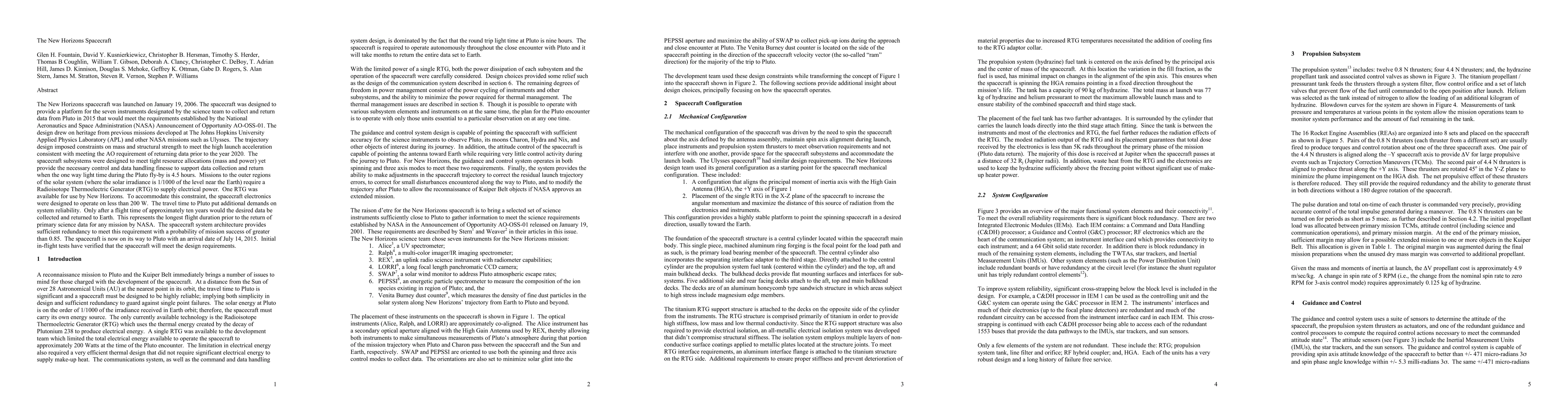 The New Horizons spacecraft, launched in 2006, was designed to collect and return data from Pluto in 2015, utilizing a single RTG for power and incorporating design heritage from previous missions. The spacecraft's architecture ensures a high probability of mission success despite stringent mass, power, and structural constraints.