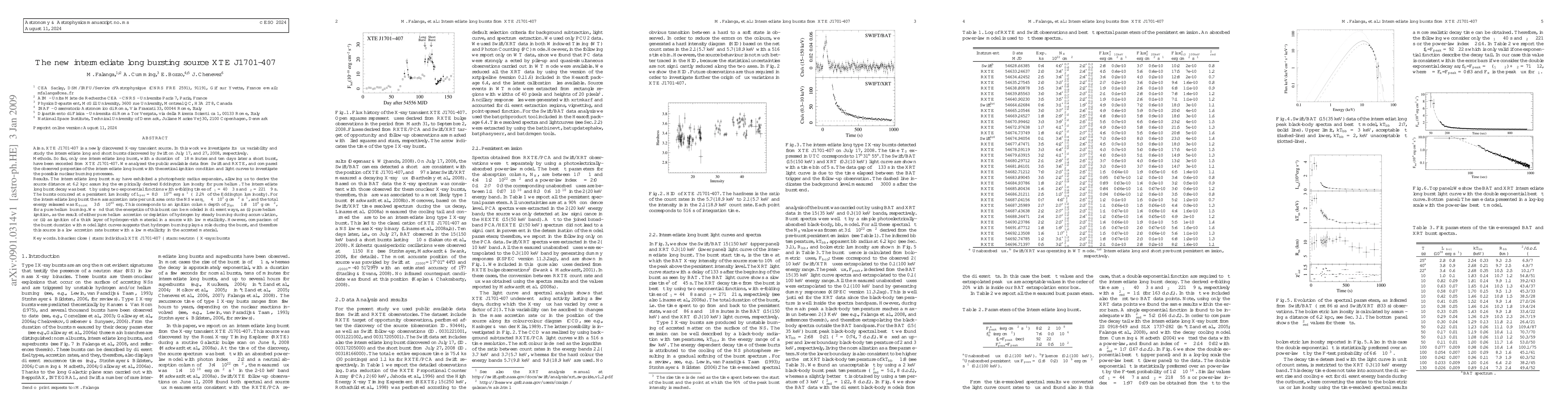 XTE J1701-407 is a newly discovered X-ray transient source. In this work we investigate its flux variability and study the intermediate long and short bursts discovered by Swift on July 17, and 27, 2008, respectively. So far, only one intermediate long burst, with a duration of ~18 minutes and ten days later a short burst, have been recorded from XTE J1701-407. We analyzed the public available data from Swift and RXTE, and compared the observed properties of the intermediate long burst with theoretical ignition condition and light curves to investigate the possible nuclear burning processes. The intermediate long burst may have exhibited a photospheric radius expansion, allowing us to derive the source distance at 6.2 kpc assuming the empirically derived Eddington luminosity for pure helium. The intermediate long burst decay was best fit by using two exponential functions with e-folding times of \tau_1=40(3) s and \tau_2=221(9) s. The bursts occurred at a persistent luminosity of L_{per}=8.3x10E36 erg/s. For the intermediate long burst the mass accretion rate per unit area onto the NS was \dot{m}=4x10E3 g/cm2/s, and the total energy released was E_{burst}=3.5x10E40 erg. This corresponds to an ignition column depth of y_{ign}=1.8x10E9 g/cm2, for a pure helium burning. We find that the energetics of this burst can be modeled in different ways, as (i) pure helium ignition, as the result of either pure helium accretion or depletion of hydrogen by steady burning during accumulation, or (ii) as ignition of a thick layer of hydrogen-rich material in a source with low metallicity. However, comparison of the burst duration with model light curves suggests that hydrogen burning plays a role during the burst, and therefore this source is a low accretion rate burster with a low metallicity in the accreted material.