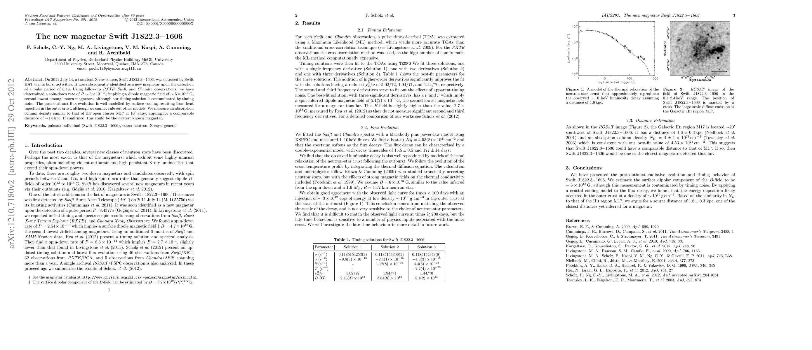 On 2011 July 14, a transient X-ray source, Swift J1822.3-1606, was detected by Swift BAT via its burst activities. It was subsequently identified as a new magnetar upon the detection of a pulse period of 8.4 s. Using follow-up RXTE, Swift, and Chandra observations, we have determined a spin-down rate of $\dot{P}\sim3\times10^{-13}$, implying a dipole magnetic field of $\sim5\times10^{13}$\,G, second lowest among known magnetars, although our timing solution is contaminated by timing noise. The post-outburst flux evolution is well modelled by surface cooling resulting from heat injection in the outer crust, although we cannot rule out other models. We measure an absorption column density similar to that of the open cluster M17 at 10\arcmin\ away, arguing for a comparable distance of $\sim$1.6\,kpc. If confirmed, this could be the nearest known magnetar.