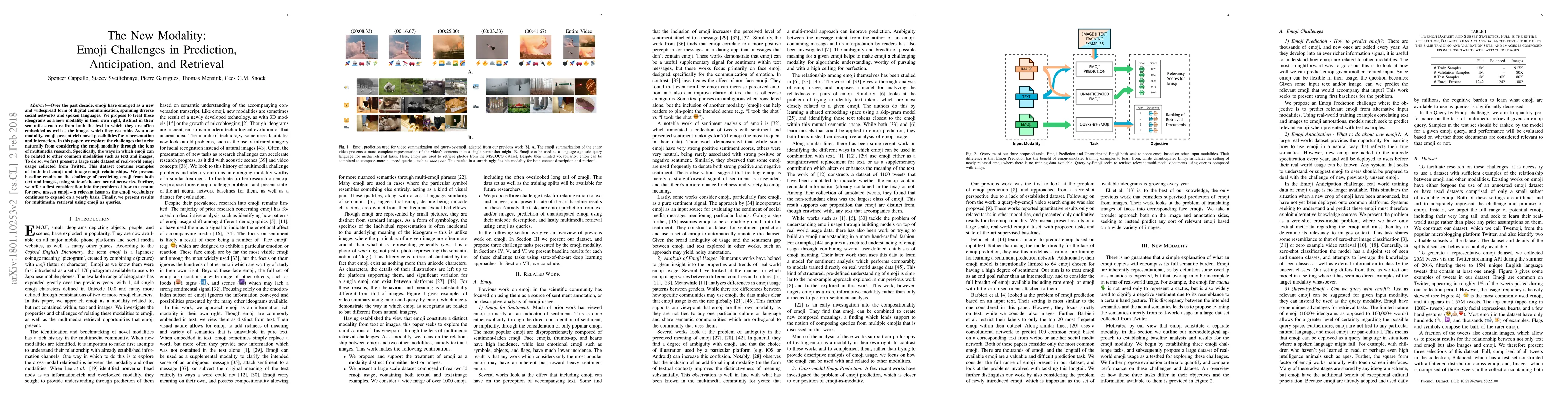 This paper explores emoji as a distinct modality in digital communication, proposing its unique semantic structure separate from text and images. It investigates challenges in predicting, anticipating, and retrieving emoji, presenting a large dataset from Twitter and baseline results using neural networks, along with considerations for handling new, unseen emoji.