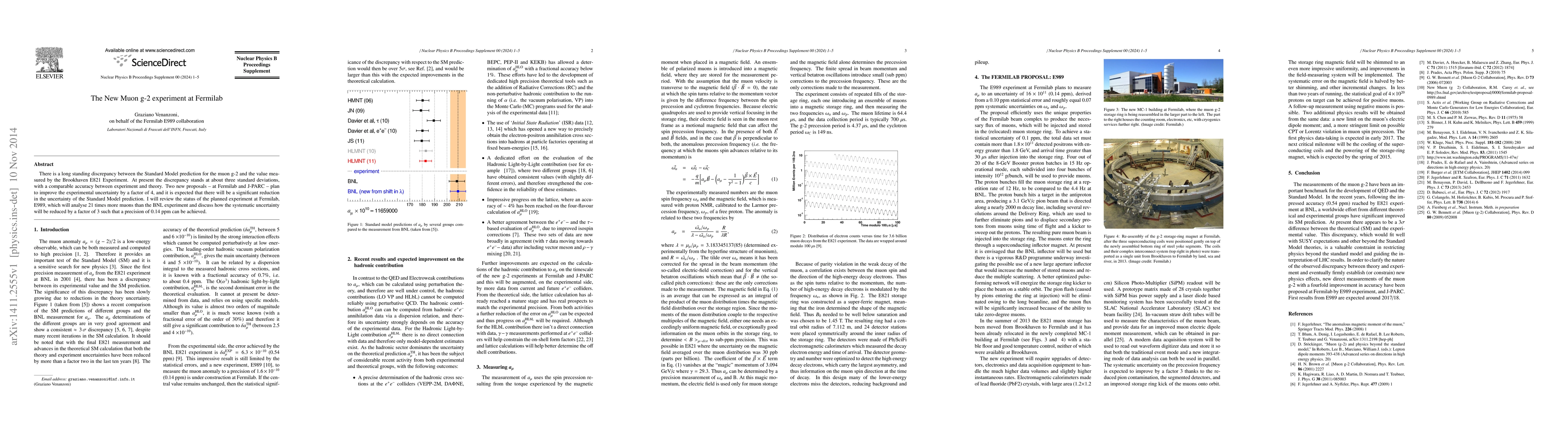 The New Muon g-2 experiment at Fermilab aims to reduce the discrepancy between the Standard Model prediction and the Brookhaven E821 measurement by improving experimental precision. E989 plans to analyze 21 times more muons and reduce systematic uncertainty by a factor of 3, achieving a precision of 0.14 ppm.