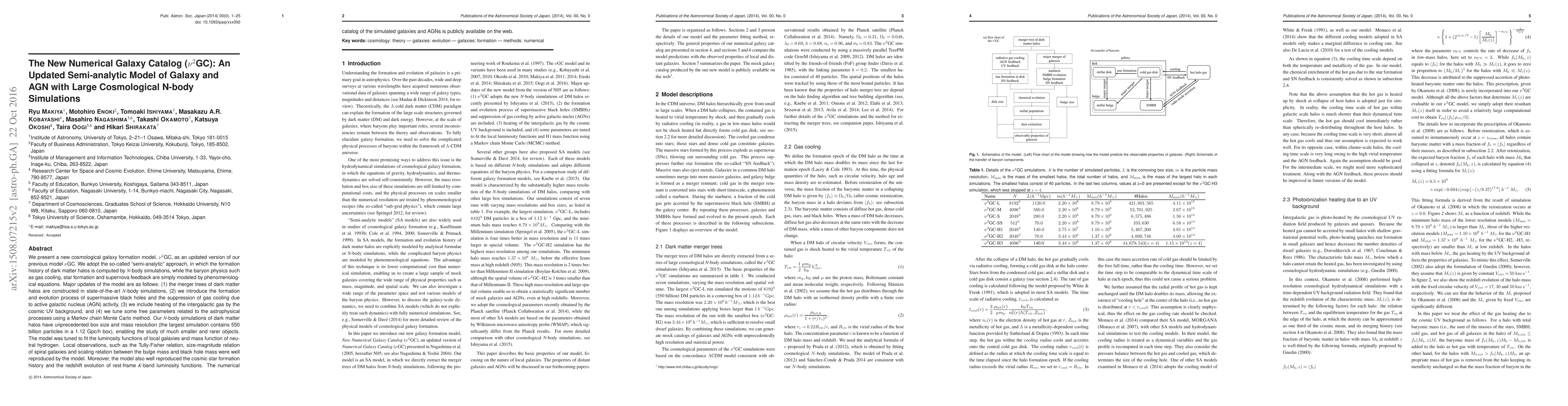 The $\nu^2$GC model is an advanced semi-analytic galaxy formation model updated from its predecessor, incorporating state-of-the-art N-body simulations to track dark matter halos and phenomenological equations for baryon physics. The model includes supermassive black hole formation, AGN feedback, and cosmic UV background heating, and is publicly available with a detailed catalog of simulated galaxies and AGNs.