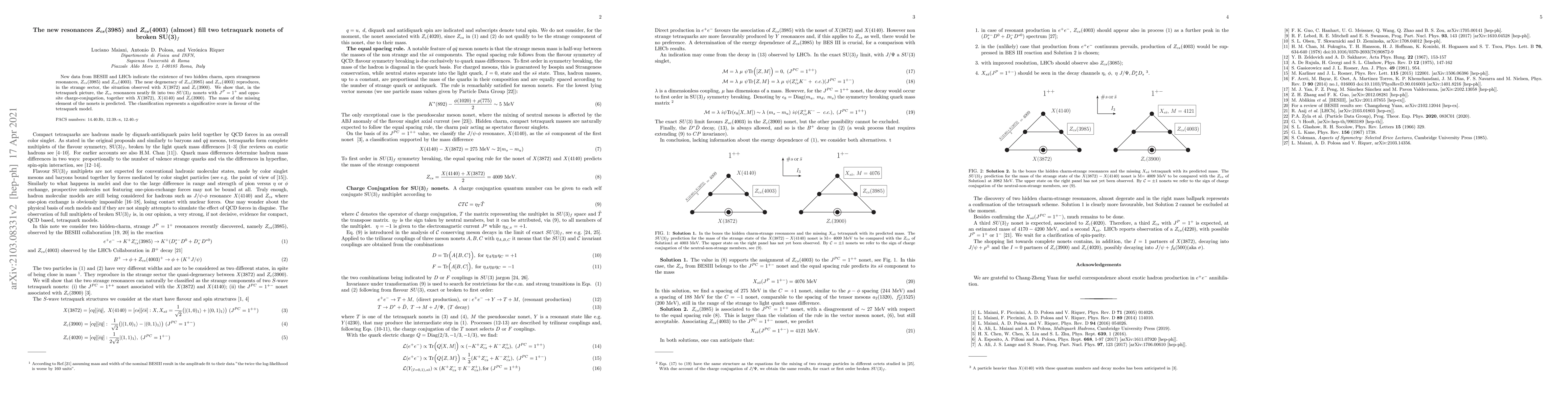The paper reports the discovery of new resonances Z_{cs}(3985) and Z_{cs}(4003) that fit into the tetraquark nonets predicted by the broken SU(3)_f symmetry, supporting the tetraquark model. The near-degeneracy of these resonances mirrors patterns seen in other exotic states, reinforcing the tetraquark hypothesis.