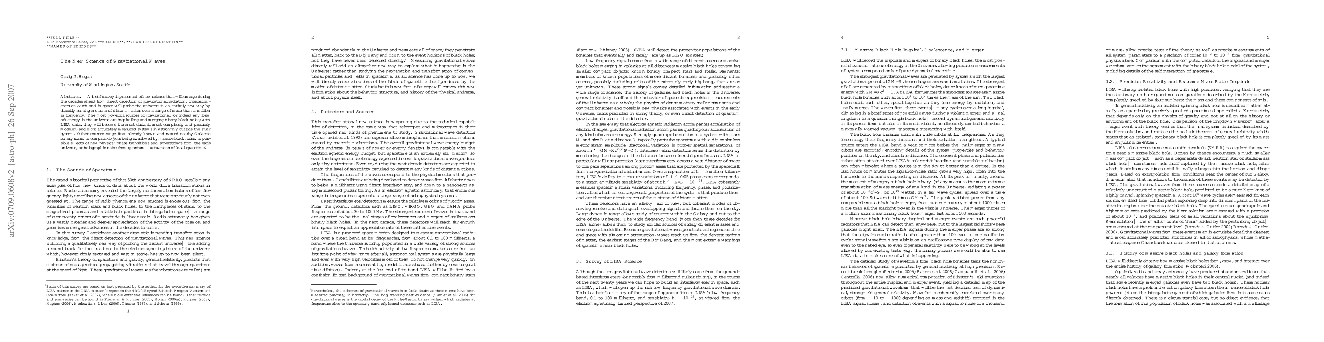 A brief survey is presented of new science that will emerge during the decades ahead from direct detection of gravitational radiation. Interferometers on earth and in space will probe the universe in an entirely new way by directly sensing motions of distant matter over a range of more than a million in frequency. The most powerful sources of gravitational (or indeed any form of) energy in the universe are inspiralling and merging binary black holes; with LISA data, they will become the most distant, most completely and precisely modeled, and most accurately measured systems in astronomy outside the solar system. Other sources range from already known and named nearby Galactic binary stars, to compact objects being swallowed by massive black holes, to possible effects of new physics: phase transitions and superstrings from the early universe, or holographic noise from quantum fluctuations of local spacetime.