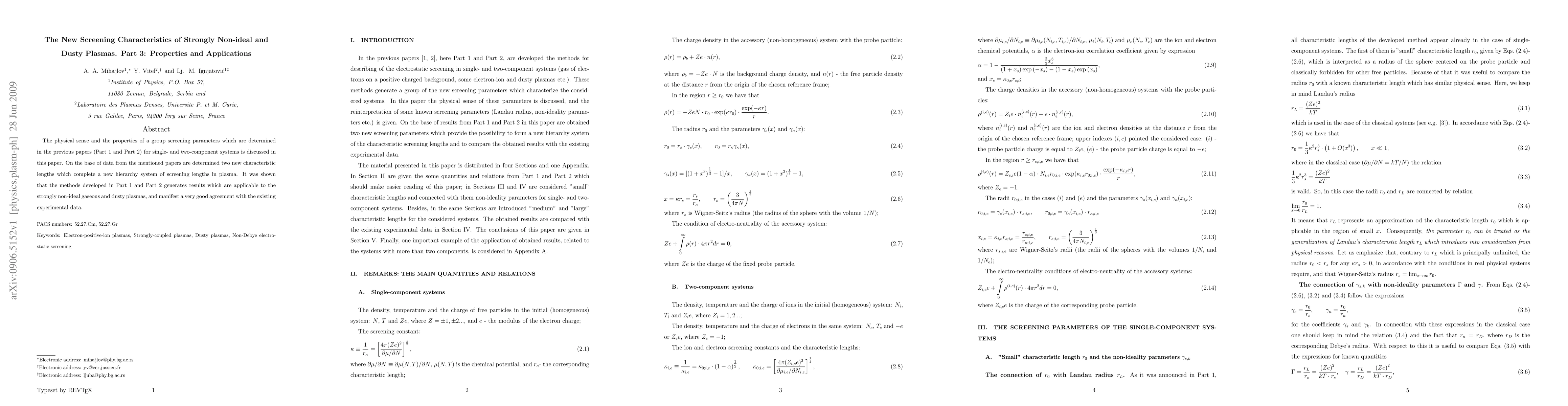 The physical sense and the properties of a group screening parameters which are determined in the previous papers (Part~1 and Part~2) for single- and two-component systems is discussed in this paper. On the base of data from the mentioned papers are determined two new characteristic lengths which complete a new hierarchy system of screening lengths in plasma. It was shown that the methods developed in Part~1 and Part~2 generates results which are applicable to the strongly non-ideal gaseous and dusty plasmas, and manifest a very good agreement with the existing experimental data.