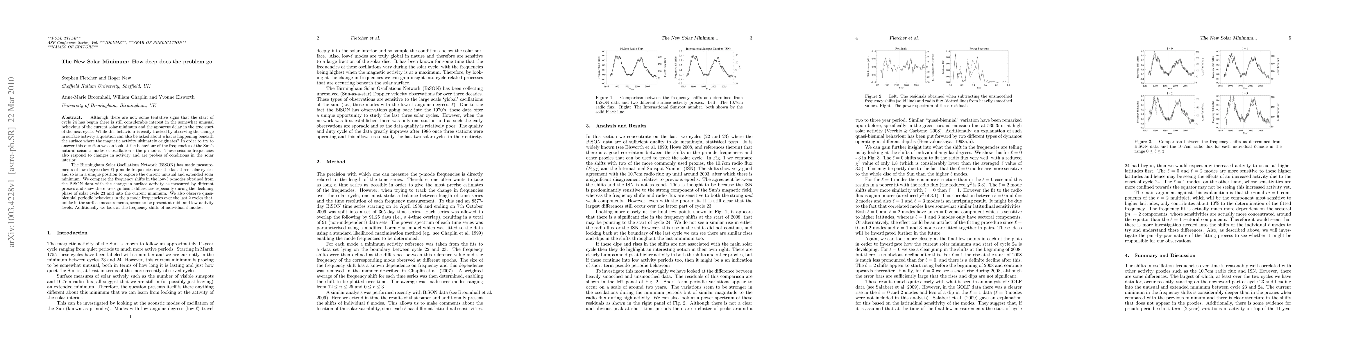 Although there are now some tentative signs that the start of cycle 24 has begun there is still considerable interest in the somewhat unusual behaviour of the current solar minimum and the apparent delay in the true start of the next cycle. While this behaviour is easily tracked by observing the change in surface activity a question can also be asked about what is happening beneath the surface where the magnetic activity ultimately originates? In order to try to answer this question we can look at the behaviour of the frequencies of the Sun's natural seismic modes of oscillation - the p modes. These seismic frequencies also respond to changes in activity and are probes of conditions in the solar interior. The Birmingham Solar Oscillations Network (BiSON) has made measurements of low-degree (low-$\ell$) p mode frequencies over the last three solar cycles, and so is in a unique position to explore the current unusual and extended solar minimum. We compare the frequency shifts in the low-$\ell$ p-modes obtained from the BiSON data with the change in surface activity as measured by different proxies and show there are significant differences especially during the declining phase of solar cycle 23 and into the current minimum. We also observe quasi-biennial periodic behaviour in the p mode frequencies over the last 2 cycles that, unlike in the surface measurements, seems to be present at mid- and low-activity levels. Additionally we look at the frequency shifts of individual $\ell$ modes.