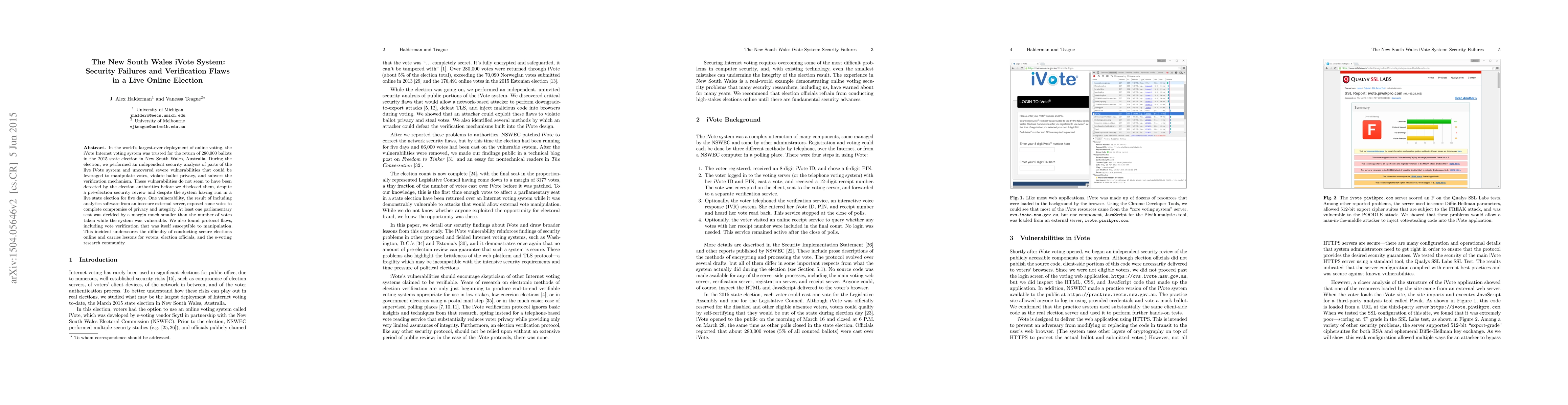 In the world's largest-ever deployment of online voting, the iVote Internet voting system was trusted for the return of 280,000 ballots in the 2015 state election in New South Wales, Australia. During the election, we performed an independent security analysis of parts of the live iVote system and uncovered severe vulnerabilities that could be leveraged to manipulate votes, violate ballot privacy, and subvert the verification mechanism. These vulnerabilities do not seem to have been detected by the election authorities before we disclosed them, despite a pre-election security review and despite the system having run in a live state election for five days. One vulnerability, the result of including analytics software from an insecure external server, exposed some votes to complete compromise of privacy and integrity. At least one parliamentary seat was decided by a margin much smaller than the number of votes taken while the system was vulnerable. We also found protocol flaws, including vote verification that was itself susceptible to manipulation. This incident underscores the difficulty of conducting secure elections online and carries lessons for voters, election officials, and the e-voting research community.