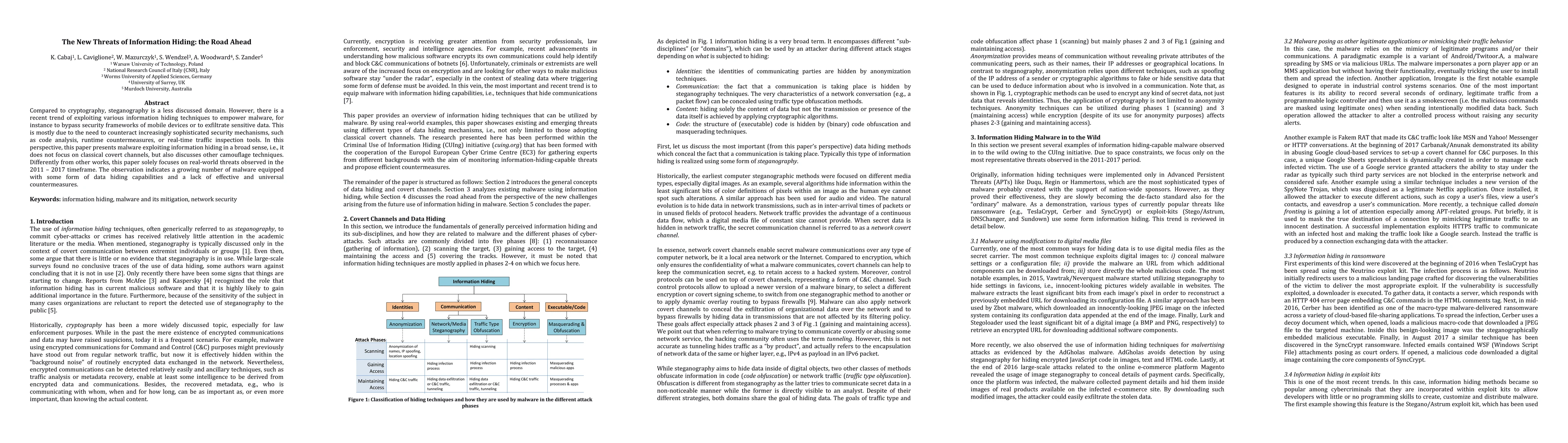 Compared to cryptography, steganography is a less discussed domain. However, there is a recent trend of exploiting various information hiding techniques to empower malware, for instance to bypass security frameworks of mobile devices or to exfiltrate sensitive data. This is mostly due to the need to counteract increasingly sophisticated security mechanisms, such as code analysis, runtime countermeasures, or real-time traffic inspection tools. In this perspective, this paper presents malware exploiting information hiding in a broad sense, i.e., it does not focus on classical covert channels, but also discusses other camouflage techniques. Differently from other works, this paper solely focuses on real-world threats observed in the 2011 - 2017 timeframe. The observation indicates a growing number of malware equipped with some form of data hiding capabilities and a lack of effective and universal countermeasures.