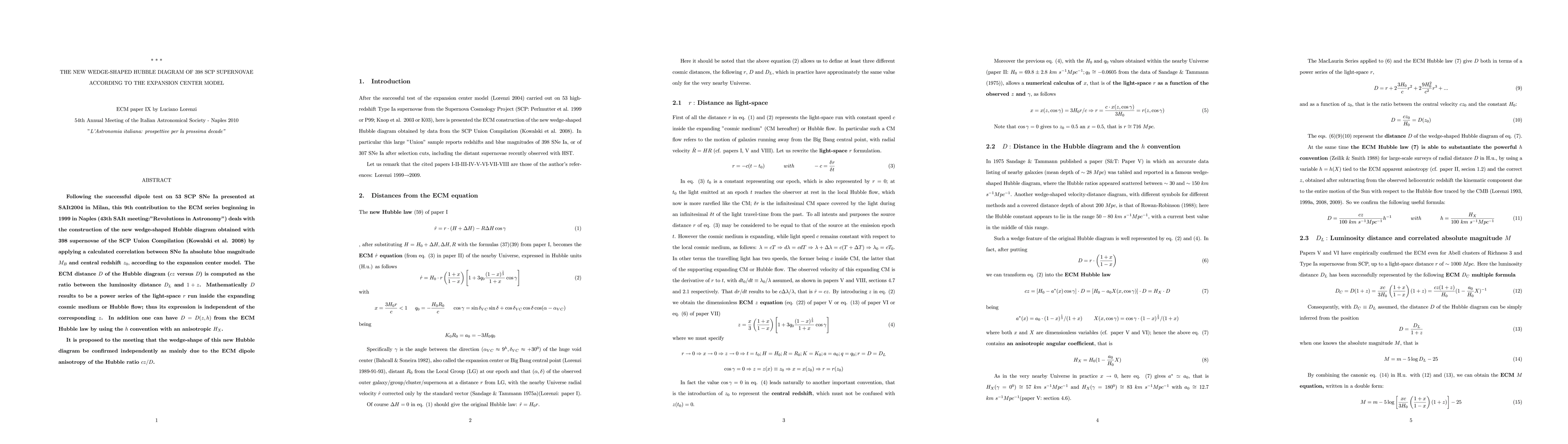 Following the successful dipole test on 53 SCP SNe Ia presented at SAIt2004 in Milan, this 9th contribution to the ECM series beginning in 1999 in Naples (43th SAIt meeting: "Revolutions in Astronomy") deals with the construction of the new wedge-shaped Hubble diagram obtained with 398 supernovae of the SCP Union Compilation (Kowalski et al. 2008) by applying a calculated correlation between SNe Ia absolute blue magnitude MB and central redshift z0, according to the expansion center model. The ECM distance D of the Hubble diagram (cz versus D) is computed as the ratio between the luminosity distance DL and 1 + z. Mathematically D results to be a power series of the light-space r run inside the expanding cosmic medium or Hubble flow; thus its expression is independent of the corresponding z. In addition one can have D = D(z, h) from the ECM Hubble law by using the h convention with an anisotropic HX. It is proposed to the meeting that the wedge-shape of this new Hubble diagram be confirmed independently as mainly due to the ECM dipole anisotropy of the Hubble ratio cz/D.