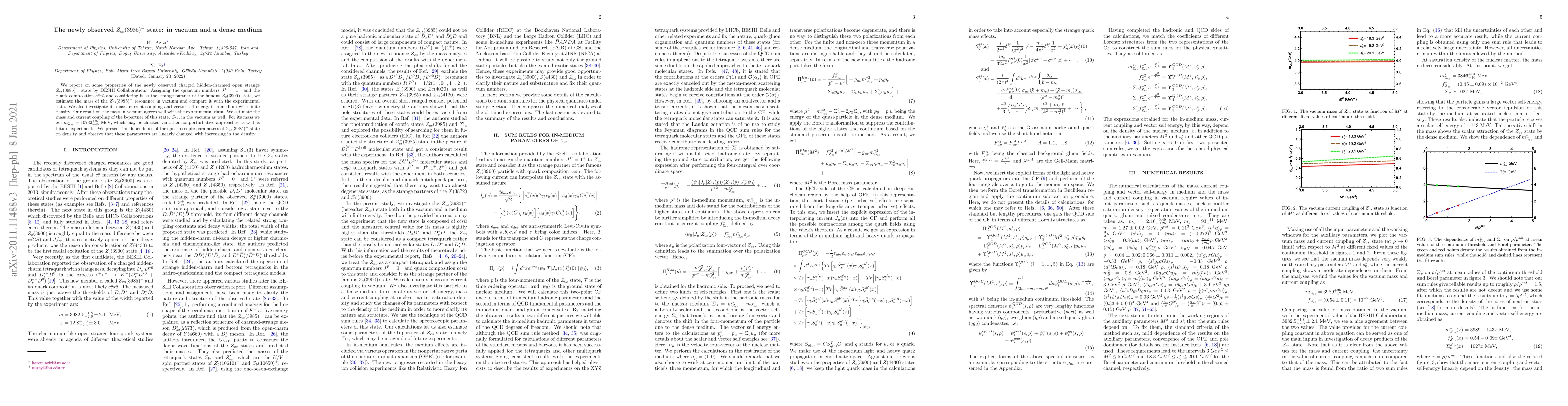 We report on some properties of the newly observed charged hidden-charmed open strange $ Z_{cs}(3985)^- $ state by BESIII Collaboration. Assigning the quantum numbers $ J^{P} = 1^{+}$ and the quark composition $ c \bar c s\bar u $ and considering it as the strange partner of the famous $ Z_c(3900) $ state, we estimate the mass of the $ Z_{cs}(3985)^- $ resonance in vacuum and compare it with the experimental data. We also investigate its mass, current coupling and vector-self energy in a medium with finite density. Our result on the mass in vacuum agrees well with the experimental data. We estimate the mass and current coupling of the b-partner of this state, $ Z_{bs}$, in the vacuum as well. For its mass we get $ m_{Z_{bs}}= 10732^{+97}_{-46}~\mbox{MeV}$, which may be checked via other nonperturbative approaches as well as future experiments. We present the dependence of the spectroscopic parameters of $ Z_{cs}(3985)^- $ state on density and observe that these parameters are linearly changed with increasing in the density.