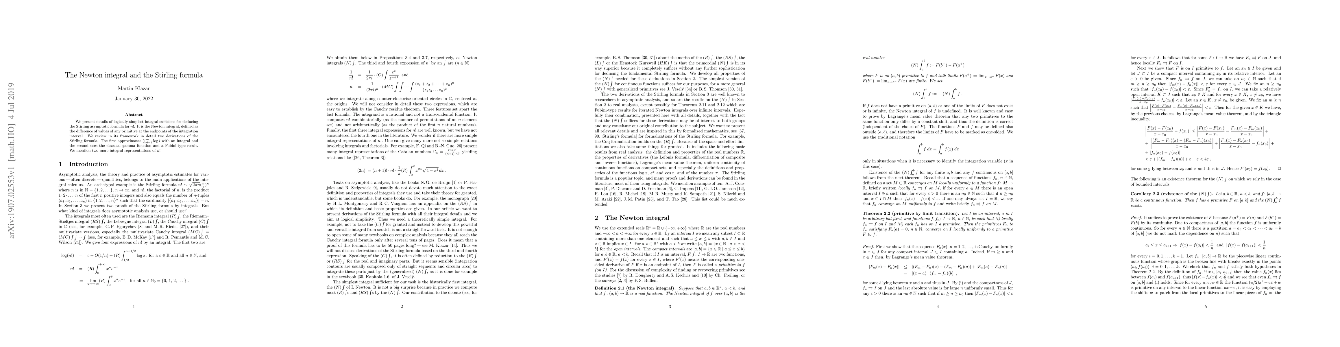 We present details of logically simplest integral sufficient for deducing the Stirling asymptotic formula for n!. It is the Newton integral, defined as the difference of values of any primitive at the endpoints of the integration interval. We review in its framework in detail two derivations of the Stirling formula. The first approximates log(1)+log(2)+...+log(n) with an integral and the second uses the classical gamma function and a Fubini-type result. We mention two more integral representations of n!.