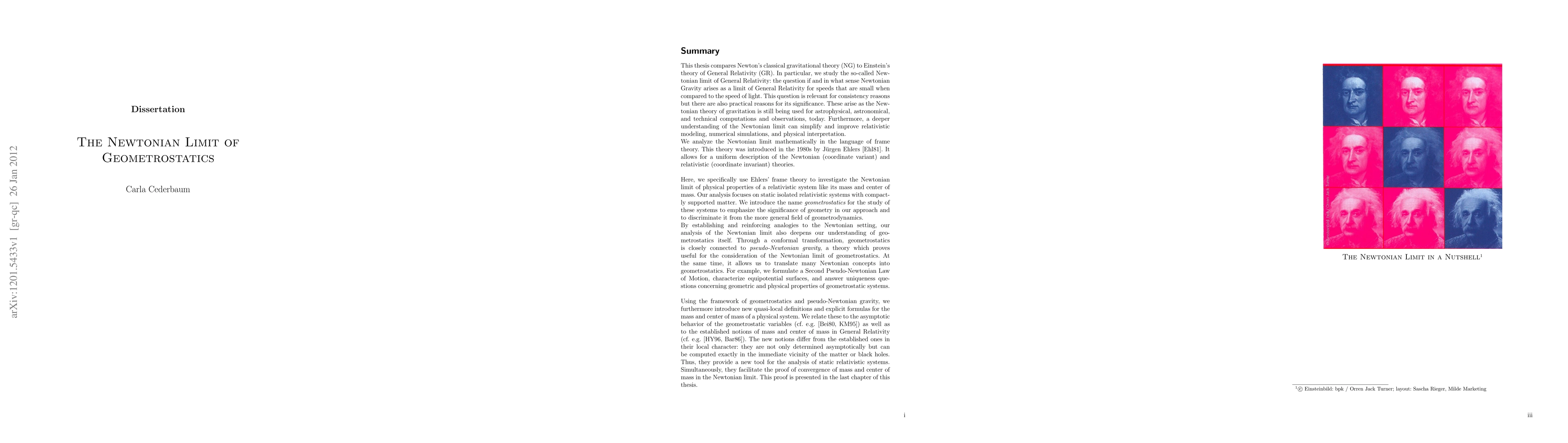This thesis discusses the Newtonian limit of General Relativity for static isolated systems with compactly supported matter. We call these systems "geometrostatic" to underline their geometric nature. We introduce new quasi-local notions of mass and center of mass that can be read off locally in the vicinity of the matter/black holes. We prove that these notions asymptotically coincide with ADM-mass and the Huisken-Yau CMC-center of mass. Moreover, we prove that they converge to Newtonian mass and center of mass in the Newtonian limit. The Newtonian limit is discussed in the language of Ehlers' frame theory. Furthermore, we prove several uniqueness claims in geometrostatics as well as other geometric and physical properties of these systems. We analyze equipotential sets, provide a pseudo-Newtonian reformulation of geometrostatics, and prove uniqueness of static photon spheres.