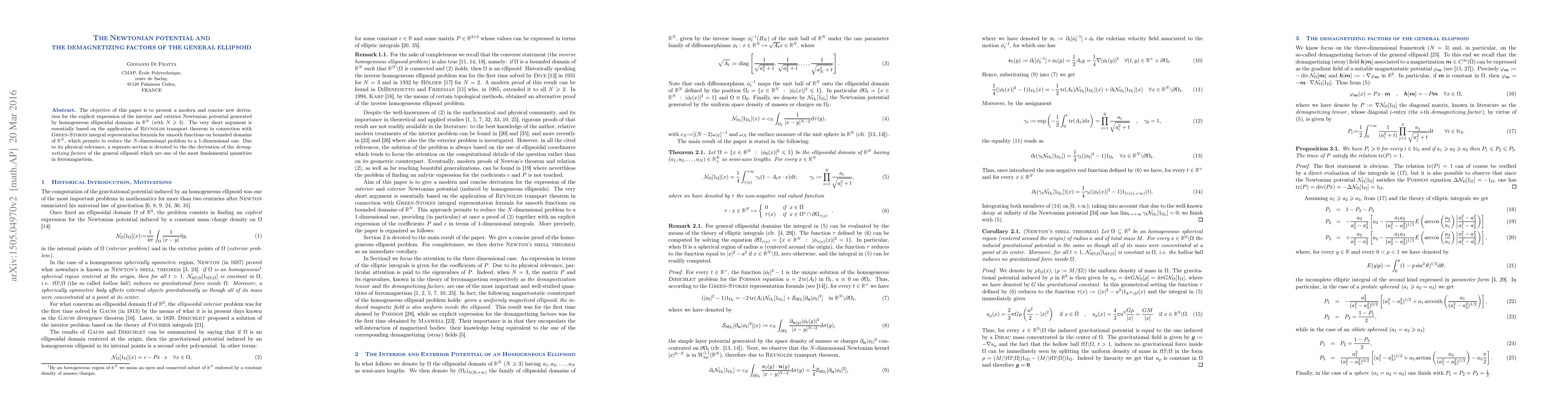 The objective of this paper is to present a modern and concise new derivation for the explicit expression of the interior and exterior Newtonian potential generated by homogeneous ellipsoidal domains in $\mathbb{R}^N$ (with $N \geqslant 3$). The very short argument is essentially based on the application of Reynolds transport theorem in connection with Green-Stokes integral representation formula for smooth functions on bounded domains of $\mathbb{R}^N$, which permits to reduce the N-dimensional problem to a 1-dimensional one. Due to its physical relevance, a separate section is devoted to the the derivation of the demagnetizing factors of the general ellipsoid which are one of the most fundamental quantities in ferromagnetism.