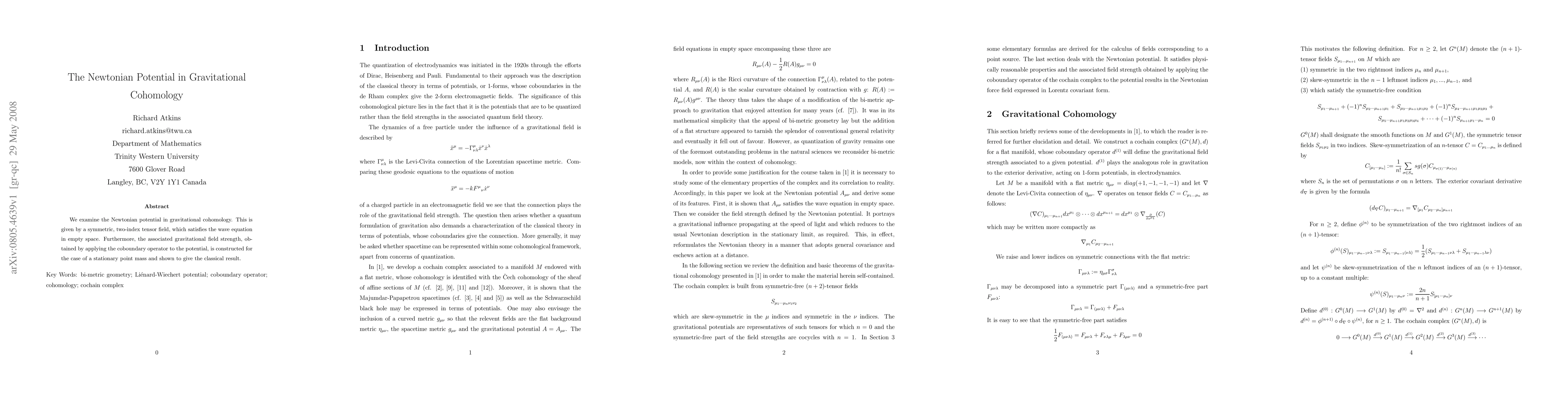 We examine the Newtonian potential in gravitational cohomology. This is given by a symmetric, two-index tensor field, which satisfies the wave equation in empty space. Furthermore, the associated gravitational field strength, obtained by applying the coboundary operator to the potential, is constructed for the case of a stationary point mass and shown to give the classical result.