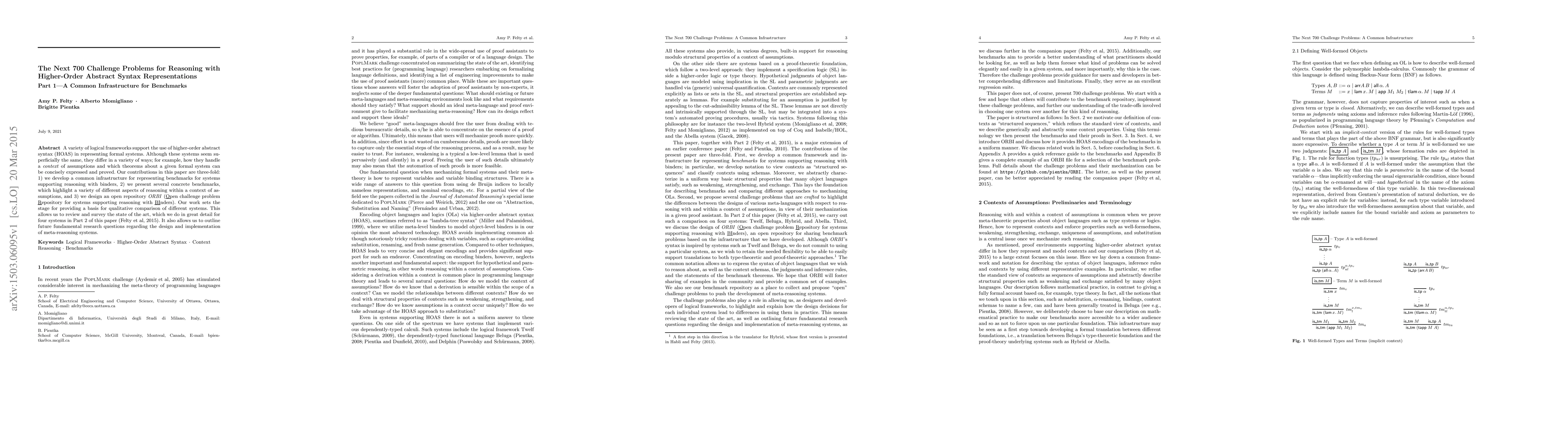 This paper develops a common infrastructure for benchmarks in systems supporting reasoning with higher-order abstract syntax (HOAS), presents several concrete benchmarks highlighting different reasoning aspects, and introduces ORBI, an open repository for these challenges. The work aims to facilitate qualitative comparisons of different systems and outlines future research questions in meta-reasoning.
