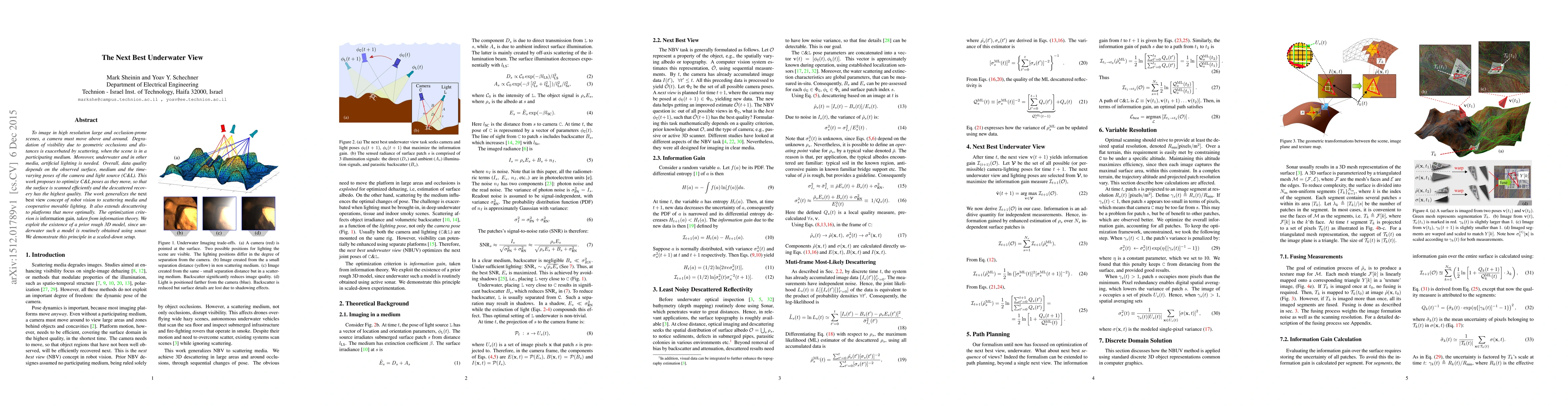 To image in high resolution large and occlusion-prone scenes, a camera must move above and around. Degradation of visibility due to geometric occlusions and distances is exacerbated by scattering, when the scene is in a participating medium. Moreover, underwater and in other media, artificial lighting is needed. Overall, data quality depends on the observed surface, medium and the time-varying poses of the camera and light source. This work proposes to optimize camera/light poses as they move, so that the surface is scanned efficiently and the descattered recovery has the highest quality. The work generalizes the next best view concept of robot vision to scattering media and cooperative movable lighting. It also extends descattering to platforms that move optimally. The optimization criterion is information gain, taken from information theory. We exploit the existence of a prior rough 3D model, since underwater such a model is routinely obtained using sonar. We demonstrate this principle in a scaled-down setup.