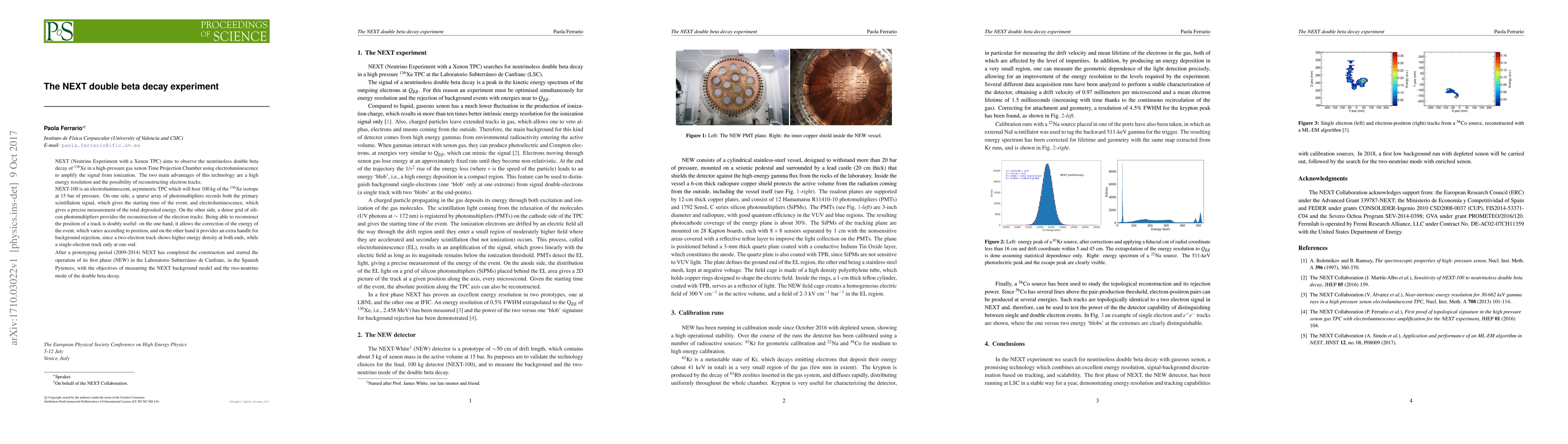 NEXT (Neutrino Experiment with a Xenon TPC) aims to observe the neutrinoless double beta decay of \ensuremath{{}^{136}\rm Xe} in a high-pressure gas xenon Time Projection Chamber using electroluminescence to amplify the signal from ionization. The two main advantages of this technology are a high energy resolution and the possibility of reconstructing electron tracks. NEXT-100 is an electroluminescent, asymmetric TPC which will host 100 kg of the \ensuremath{{}^{136}\rm Xe} isotope at 15 bar of pressure. On one side, a sparse array of photomultipliers records both the primary scintillation signal, which gives the starting time of the event, and electroluminescence, which gives a precise measurement of the total deposited energy. On the other side, a dense grid of silicon photomultipliers provides the reconstruction of the electron tracks. Being able to reconstruct the position of a track is doubly useful: on the one hand, it allows the correction of the energy of the event, which varies according to position, and on the other hand it provides an extra handle for background rejection, since a two-electron track shows higher energy density at both ends, while a single-electron track only at one end. After a prototyping period (2009-2014) NEXT has completed the construction and started the operation of its first phase (NEW) in the Laboratorio Subterr\'aneo de Canfranc, in the Spanish Pyrenees, with the objectives of measuring the NEXT background model and the two-neutrino mode of the double beta decay.
