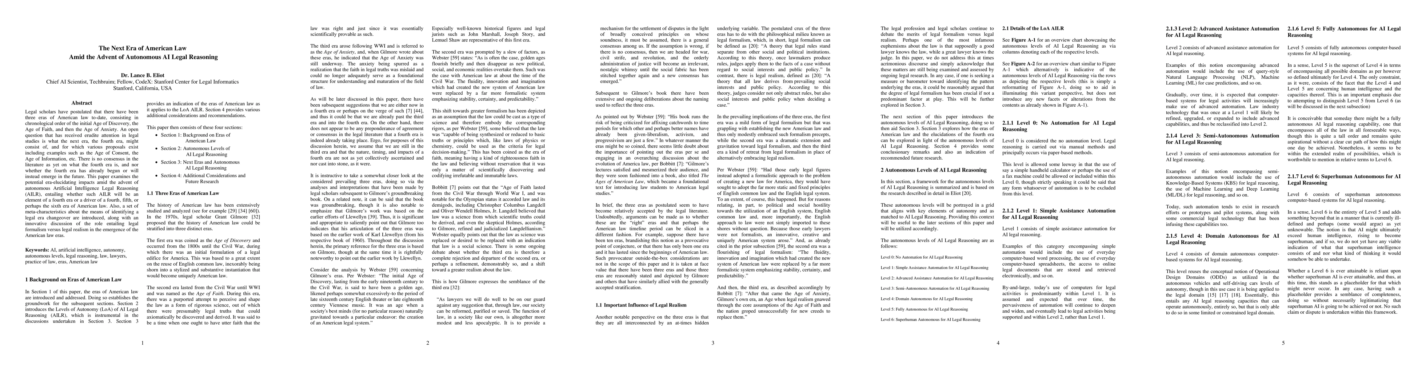 Legal scholars have postulated that there have been three eras of American law to-date, consisting in chronological order of the initial Age of Discovery, the Age of Faith, and then the Age of Anxiety. An open question that has received erudite attention in legal studies is what the next era, the fourth era, might consist of, and for which various proposals exist including examples such as the Age of Consent, the Age of Information, etc. There is no consensus in the literature as yet on what the fourth era is, and nor whether the fourth era has already begun or will instead emerge in the future. This paper examines the potential era-elucidating impacts amid the advent of autonomous Artificial Intelligence Legal Reasoning (AILR), entailing whether such AILR will be an element of a fourth era or a driver of a fourth, fifth, or perhaps the sixth era of American law. Also, a set of meta-characteristics about the means of identifying a legal era changeover are introduced, along with an innovative discussion of the role entailing legal formalism versus legal realism in the emergence of the American law eras.