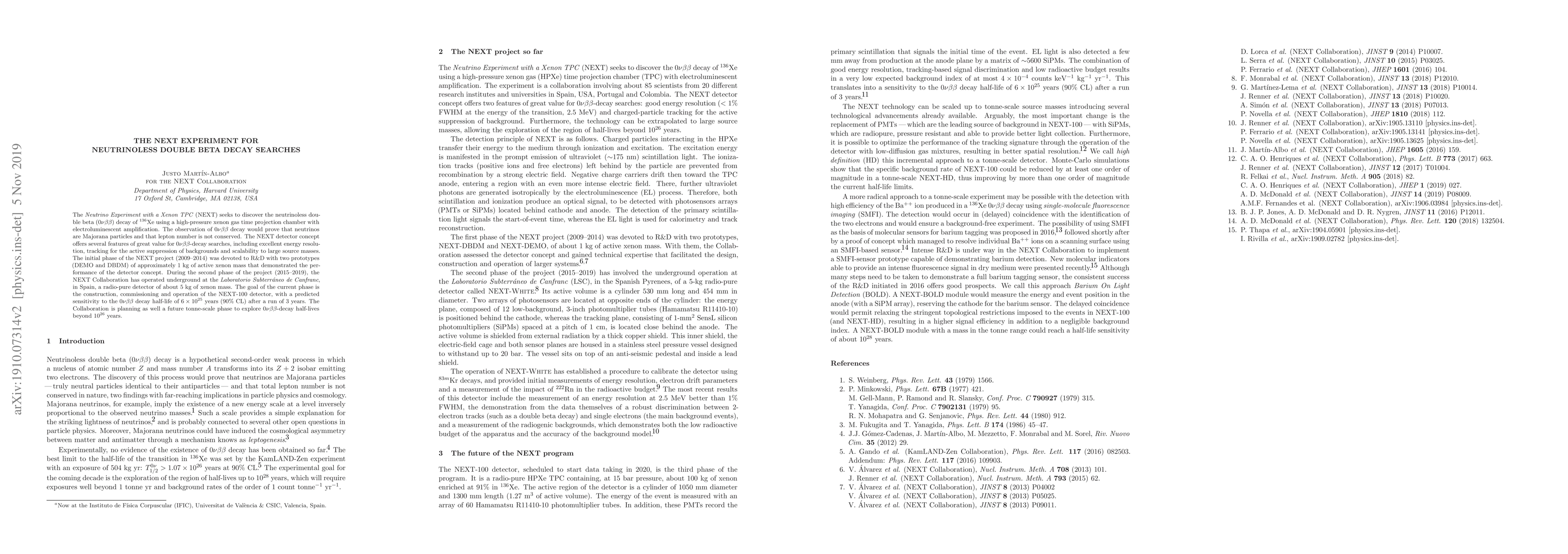 The NEXT experiment aims to detect neutrinoless double beta decay in $^{136}$Xe using a high-pressure xenon gas time projection chamber, potentially proving neutrinos are Majorana particles. The project has evolved through phases of R&D and operation, with the current phase focusing on a 100 kg detector aiming for a half-life sensitivity of $6\times10^{25}$ years after three years of operation.