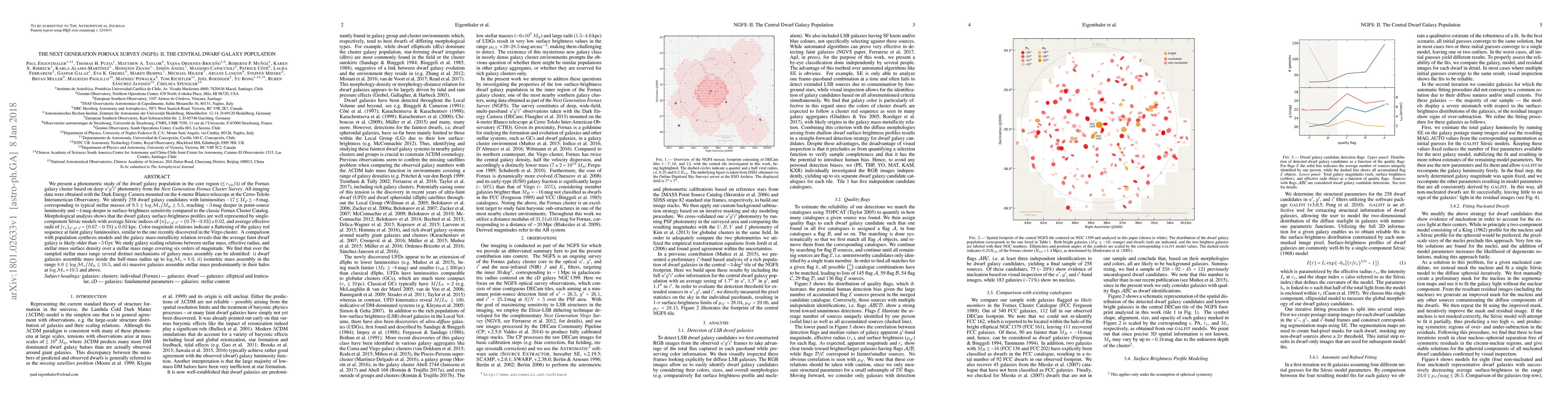 We present a photometric study of the dwarf galaxy population in the core region ($< r_{\rm vir}/4$) of the Fornax galaxy cluster based on deep $u'g'i'$ photometry from the Next Generation Fornax Cluster Survey. All imaging data were obtained with the Dark Energy Camera mounted on the 4-meter Blanco telescope at the Cerro-Tololo Interamerican Observatory. We identify 258 dwarf galaxy candidates with luminosities $-17 < M_{g'} < -8$ mag, corresponding to typical stellar masses of $9.5\gtrsim \log{\cal M}_{\star}/M_\odot \gtrsim 5.5$, reaching $\sim\!3$ mag deeper in point-source luminosity and $\sim\!4$ mag deeper in surface-brightness sensitivity compared to the classic Fornax Cluster Catalog. Morphological analysis shows that surface-brightness profiles are well represented by single-component S\'ersic models with average S\'ersic indices of $\langle n\rangle_{u',g',i'}=(0.78-0.83) \pm 0.02$, and average effective radii of $\langle r_e\rangle_{u',g',i'}\!=(0.67-0.70) \pm 0.02$ kpc. Color-magnitude relations indicate a flattening of the galaxy red sequence at faint galaxy luminosities, similar to the one recently discovered in the Virgo cluster. A comparison with population synthesis models and the galaxy mass-metallicity relation reveals that the average faint dwarf galaxy is likely older than ~5 Gyr. We study galaxy scaling relations between stellar mass, effective radius, and stellar mass surface density over a stellar mass range covering six orders of magnitude. We find that over the sampled stellar mass range several distinct mechanisms of galaxy mass assembly can be identified: i) dwarf galaxies assemble mass inside the half-mass radius up to $\log{\cal M}_{\star}$ ~8.0, ii) isometric mass assembly in the range $8.0 < \log{\cal M}_{\star}/M_\odot < 10.5$, and iii) massive galaxies assemble stellar mass predominantly in their halos at $\log{\cal M}_{\star}$ ~10.5 and above.