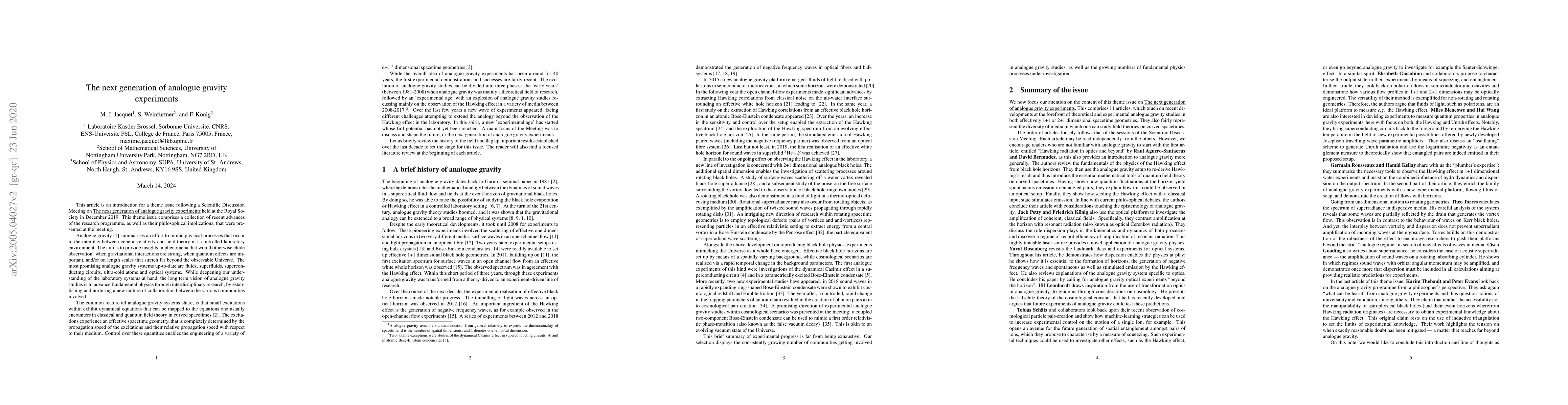 This article is an introduction for a theme issue following a Scientific Discussion Meeting on \emph{The next generation of analogue gravity experiments} held at the Royal Society in December 2019. This theme issue comprises a collection of recent advances of the research programme, as well as their philosophical implications, that were presented at the meeting.