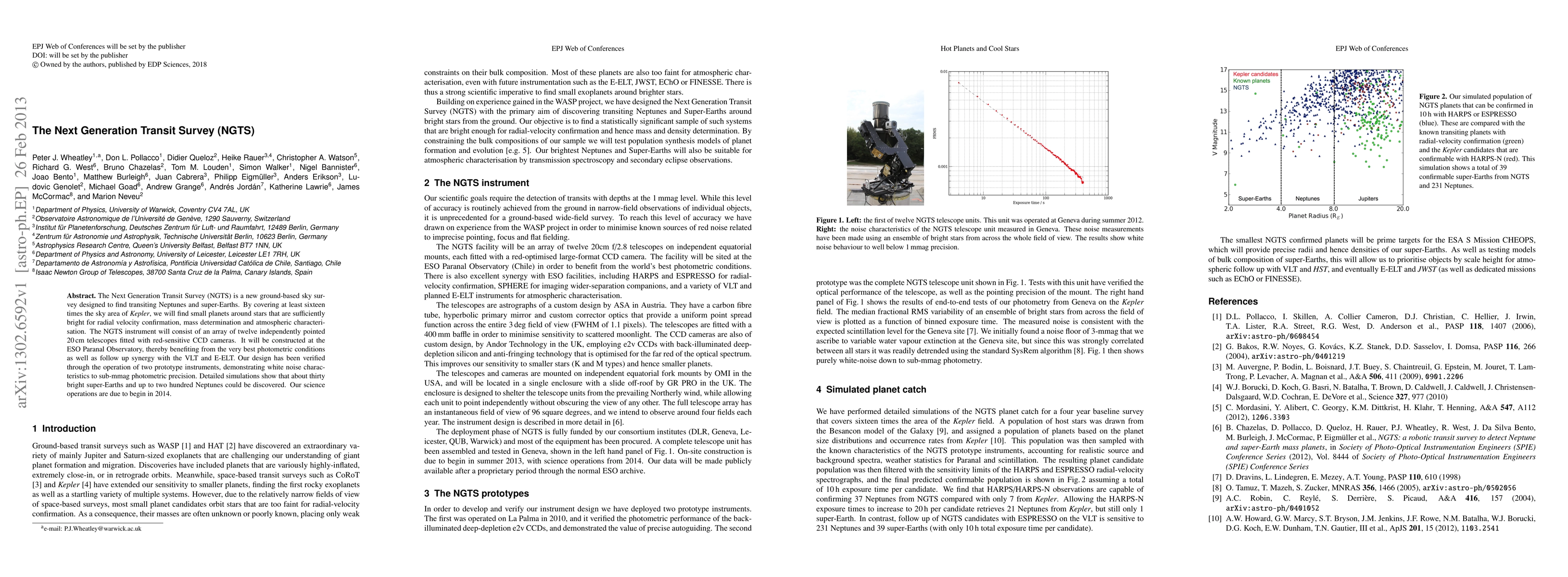 The Next Generation Transit Survey (NGTS) aims to discover small planets around bright stars using an array of 12 telescopes. It has the potential to find up to 200 Neptunes and 30 super-Earths.