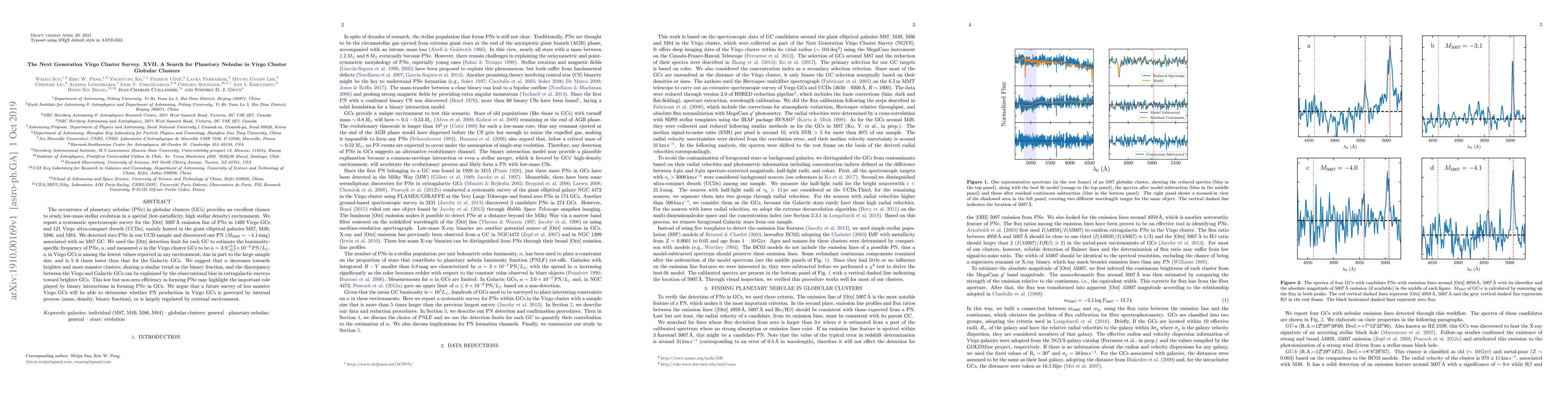 The occurrence of planetary nebulae (PNe) in globular clusters (GCs) provides an excellent chance to study low-mass stellar evolution in a special (low-metallicity, high stellar density) environment. We report a systematic spectroscopic survey for the [O{\sc iii}] 5007 emission line of PNe in 1469 Virgo GCs and 121 Virgo ultra-compact dwarfs (UCDs), mainly hosted in the giant elliptical galaxies M87, M49, M86, and M84. We detected zero PNe in our UCD sample and discovered one PN ($M_{5007} = -4.1$ mag) associated with an M87 GC. We used the [O{\sc iii}] detection limit for each GC to estimate the luminosity-specific frequency of PNe, $\alpha$, and measured $\alpha$ in the Virgo cluster GCs to be $\alpha \sim 3.9_{-0.7}^{+5.2}\times 10^{-8}\mathrm{PN}/L_\odot$. $\alpha$ in Virgo GCs is among the lowest values reported in any environment, due in part to the large sample size, and is 5--6 times lower than that for the Galactic GCs. We suggest that $\alpha$ decreases towards brighter and more massive clusters, sharing a similar trend as the binary fraction, and the discrepancy between the Virgo and Galactic GCs can be explained by the observational bias in extragalactic surveys toward brighter GCs. This low but non-zero efficiency in forming PNe may highlight the important role played by binary interactions in forming PNe in GCs. We argue that a future survey of less massive Virgo GCs will be able to determine whether PN production in Virgo GCs is governed by internal process (mass, density, binary fraction), or is largely regulated by external environment.