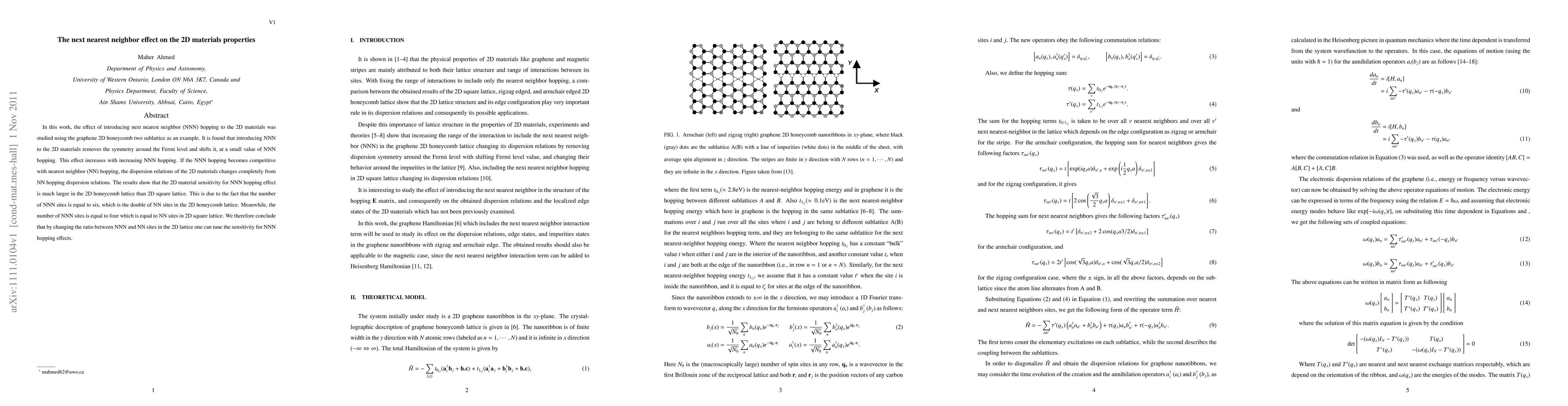 In this work, the effect of introducing next nearest neighbor (NNN) hopping to the 2D materials was studied using the graphene 2D honeycomb two sublattice as an example. It is found that introducing NNN to the 2D materials removes the symmetry around the Fermi level and shifts it, at a small value of NNN hopping. This effect increases with increasing NNN hopping. If the NNN hopping becomes competitive with nearest neighbor (NN) hopping, the dispersion relations of the 2D materials changes completely from NN hopping dispersion relations. The results show that the 2D material sensitivity for NNN hopping effect is much larger in the 2D honeycomb lattice than 2D square lattice. This is due to the fact that the number of NNN sites is equal to six, which is the double of NN sites in the 2D honeycomb lattice. Meanwhile, the number of NNN sites is equal to four which is equal to NN sites in 2D square lattice. We therefore conclude that by changing the ratio between NNN and NN sites in the 2D lattice one can tune the sensitivity for NNN hopping effects.