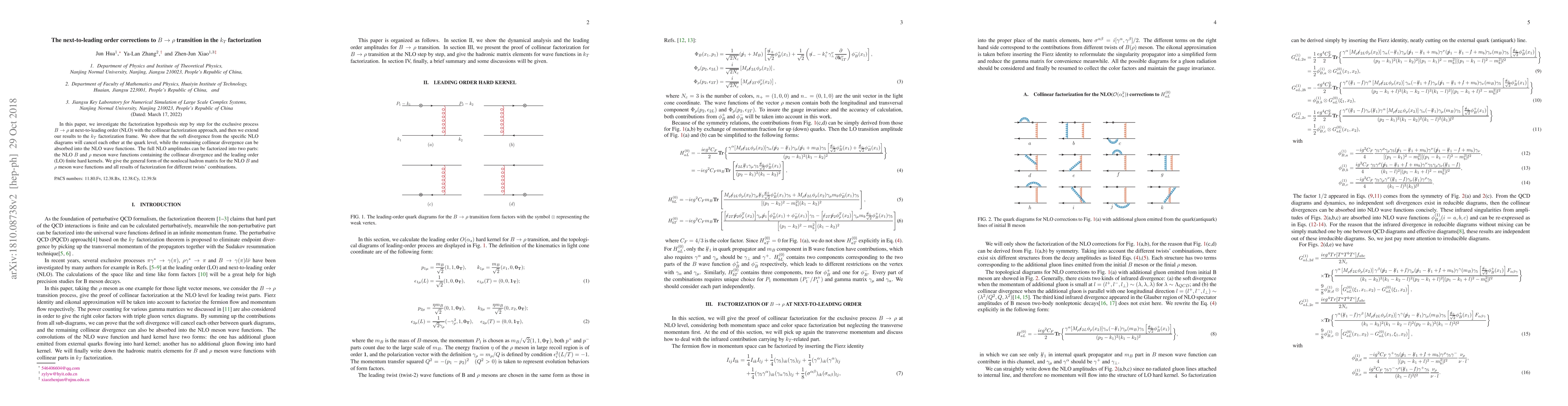 The paper presents a detailed investigation of the factorization of NLO corrections for the $B o ho$ transition in both collinear and $k_T$ factorization approaches, including the treatment of soft and collinear divergences.