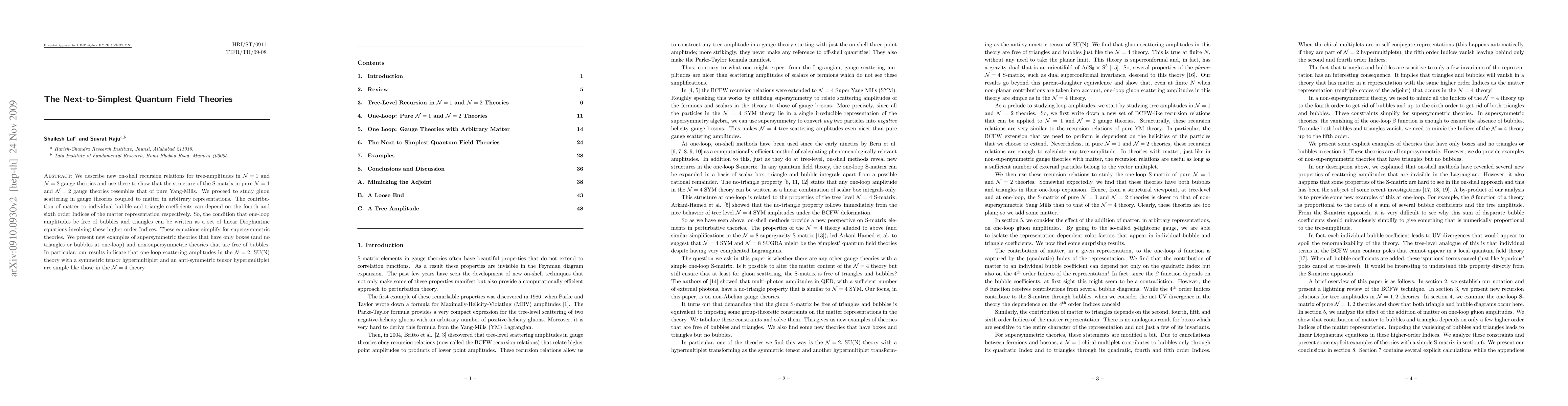 We describe new on-shell recursion relations for tree-amplitudes in N=1 and N=2 gauge theories and use these to show that the structure of the S-matrix in pure N=1 and N=2 gauge theories resembles that of pure Yang-Mills. We proceed to study gluon scattering in gauge theories coupled to matter in arbitrary representations. The contribution of matter to individual bubble and triangle coefficients can depend on the fourth and sixth order Indices of the matter representation respectively. So, the condition that one-loop amplitudes be free of bubbles and triangles can be written as a set of linear Diophantine equations involving these higher-order Indices. These equations simplify for supersymmetric theories. We present new examples of supersymmetric theories that have only boxes (and no triangles or bubbles at one-loop) and non-supersymmetric theories that are free of bubbles. In particular, our results indicate that one-loop scattering amplitudes in the N=2, SU(K) theory with a symmetric tensor hypermultiplet and an anti-symmetric tensor hypermultiplet are simple like those in the N=4 theory.