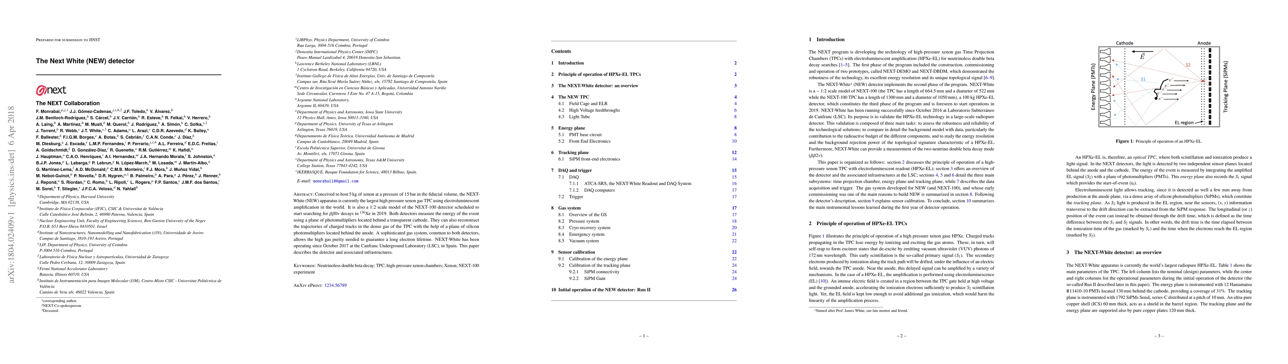 The NEXT-White (NEW) detector, the largest high-pressure xenon gas TPC with electroluminescent amplification, operates at the Canfranc Underground Laboratory in Spain since October 2017. It serves as a 1:2 scale model for the NEXT-100 detector, designed to search for $\beta\beta 0\nu$ decays in 136Xe.