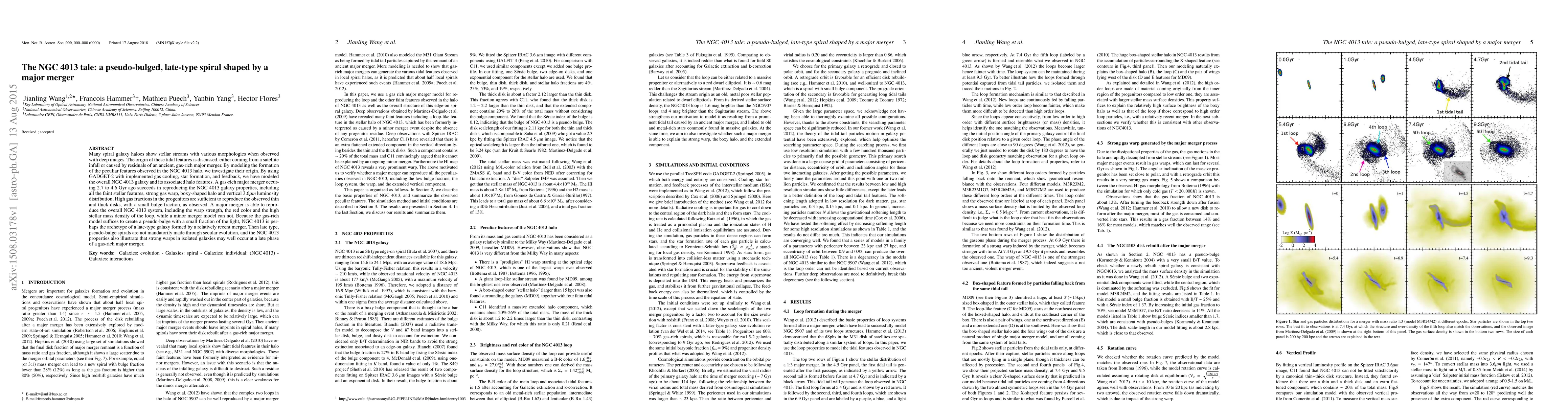 Many spiral galaxy haloes show stellar streams with various morphologies when observed with deep images. The origin of these tidal features is discussed, either coming from a satellite infall or caused by residuals of an ancient, gas-rich major merger. By modelling the formation of the peculiar features observed in the NGC 4013 halo, we investigate their origin. By using GADGET -2 with implemented gas cooling, star formation, and feedback, we have modelled the overall NGC 4013 galaxy and its associated halo features. A gas-rich major merger occurring 2.7-4.6 Gyr ago succeeds in reproducing the NGC 4013 galaxy properties, including all the faint stellar features, strong gas warp, boxy-shaped halo and vertical 3.6 mum luminosity distribution. High gas fractions in the progenitors are sufficient to reproduce the observed thin and thick discs, with a small bulge fraction, as observed. A major merger is able to reproduce the overall NGC 4013 system, including the warp strength, the red colour and the high stellar mass density of the loop, while a minor merger model cannot. Because the gas-rich model suffices to create a pseudo-bulge with a small fraction of the light, NGC 4013 is perhaps the archetype of a late-type galaxy formed by a relatively recent merger. Then late type, pseudo-bulge spirals are not mandatorily made through secular evolution, and the NGC 4013 properties also illustrate that strong warps in isolated galaxies may well occur at a late phase of a gas-rich major merger.