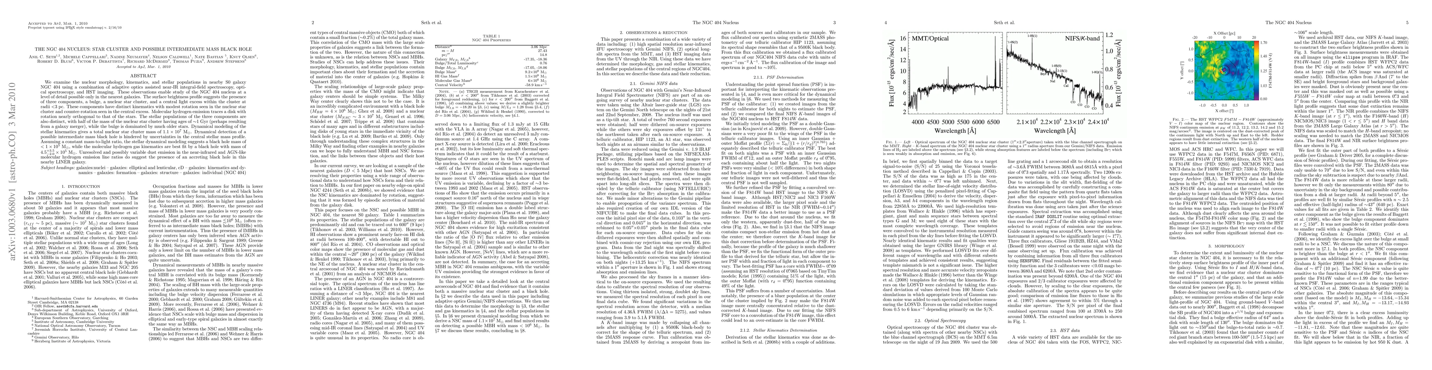 This study of NGC 404 reveals distinct components including a bulge, a nuclear star cluster, and a central light excess, each with unique kinematics and stellar populations. The nuclear star cluster may host an intermediate mass black hole, with estimates suggesting a mass of <1x10^5 Msol from stellar dynamics and 4.5x10^5 Msol from gas kinematics.