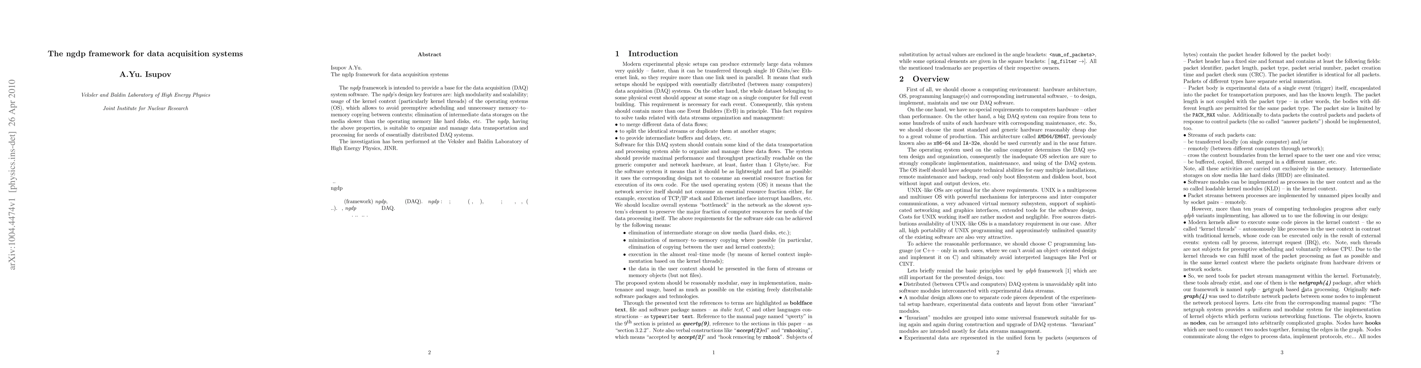 The ngdp framework is intended to provide a base for the data acquisition (DAQ) system software. The ngdp's design key features are: high modularity and scalability; usage of the kernel context (particularly kernel threads) of the operating systems (OS), which allows to avoid preemptive scheduling and unnecessary memory--to--memory copying between contexts; elimination of intermediate data storages on the media slower than the operating memory like hard disks, etc. The ngdp, having the above properties, is suitable to organize and manage data transportation and processing for needs of essentially distributed DAQ systems. The investigation has been performed at the Veksler and Baldin Laboratory of High Energy Physics, JINR.