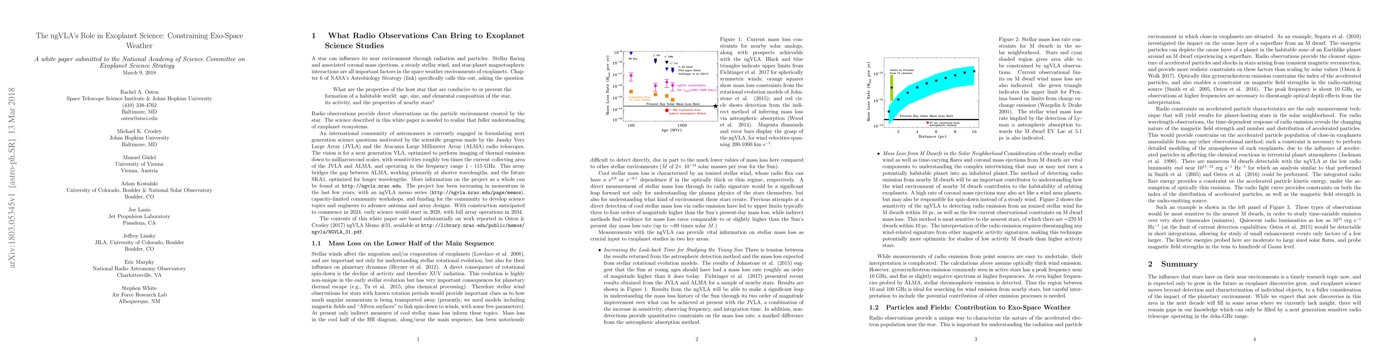 The paper discusses the potential of a next-generation VLA (ngVLA) for radio observations to study exo-space weather, focusing on stellar wind, flares, and coronal mass ejections affecting exoplanets. It emphasizes the need for improved sensitivity and frequency range to directly measure stellar mass loss and characterize accelerated electron populations near stars.