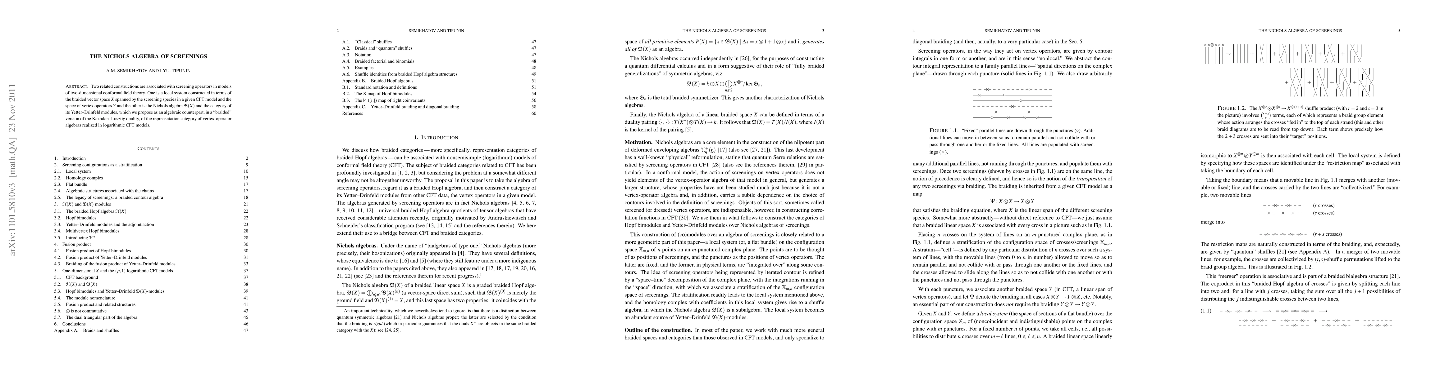 This paper explores two constructions linked to screening operators in two-dimensional conformal field theory: a local system based on the braided vector space X and a Nichols algebra B(X) representing the category of Yetter-Drinfeld modules, proposed as an algebraic counterpart to the representation category of vertex-operator algebras in logarithmic conformal field theory.