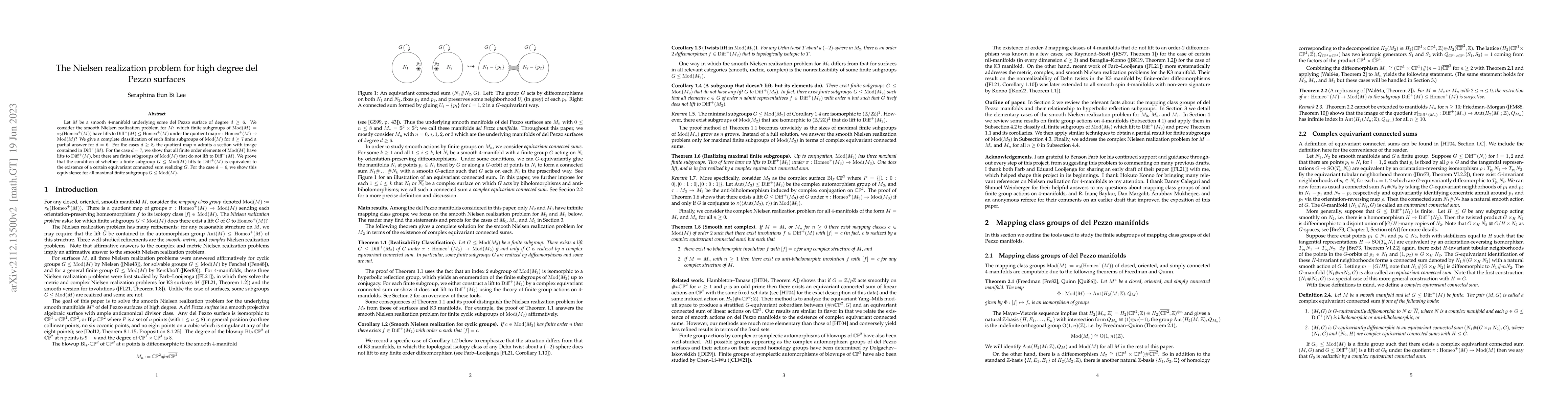 This paper classifies finite subgroups of the mapping class group of high degree del Pezzo surfaces that lift to the diffeomorphism group. For degrees $d \geq 7$, it provides a complete classification, while for $d = 6$, it focuses on maximal finite subgroups.