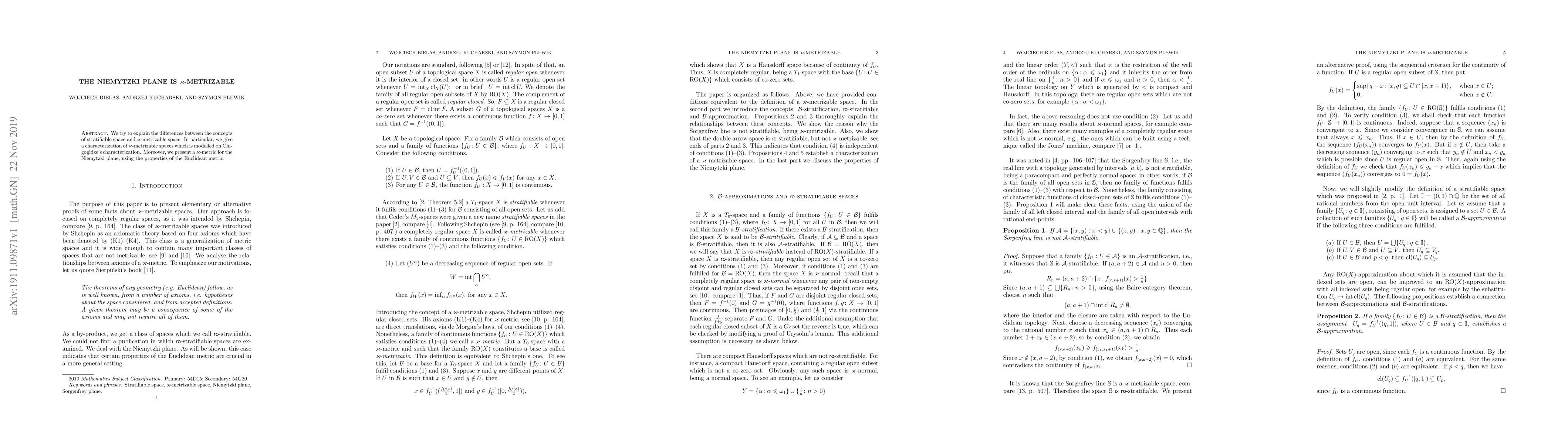 This paper explores the distinction between stratifiable and $\varkappa$-metrizable spaces, providing a characterization of $\varkappa$-metrizable spaces inspired by Chigogidze's work, and introduces a $\varkappa$-metric for the Niemytzki plane based on the Euclidean metric.