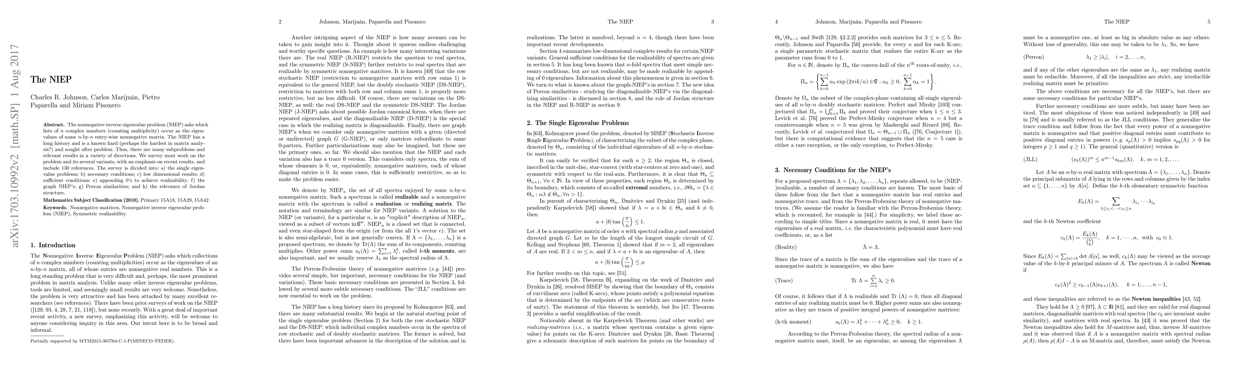 The nonnegative inverse eigenvalue problem (NIEP) asks which lists of $n$ complex numbers (counting multiplicity) occur as the eigenvalues of some $n$-by-$n$ entry-wise nonnegative matrix. The NIEP has a long history and is a known hard (perhaps the hardest in matrix analysis?) and sought after problem. Thus, there are many subproblems and relevant results in a variety of directions. We survey most work on the problem and its several variants, with an emphasis on recent results, and include 130 references. The survey is divided into: a) the single eigenvalue problems; b) necessary conditions; c) low dimensional results; d) sufficient conditions; e) appending 0's to achieve realizability; f) the graph NIEP's; g) Perron similarities; and h) the relevance of Jordan structure.