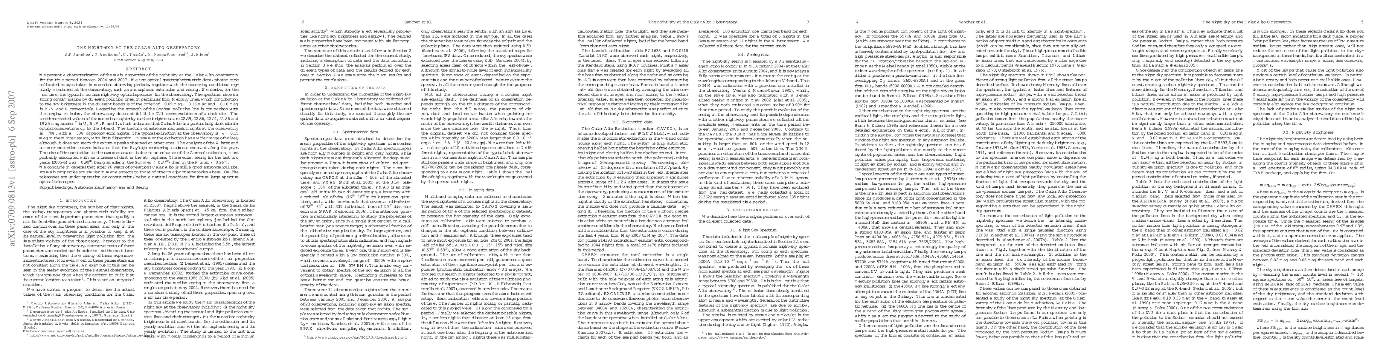 The research characterized the night-sky properties at the Calar Alto Observatory using optical spectrophotometric data, photometric calibrated images, and regularly monitored observing conditions like atmospheric extinction and seeing over the period 2004-2007.