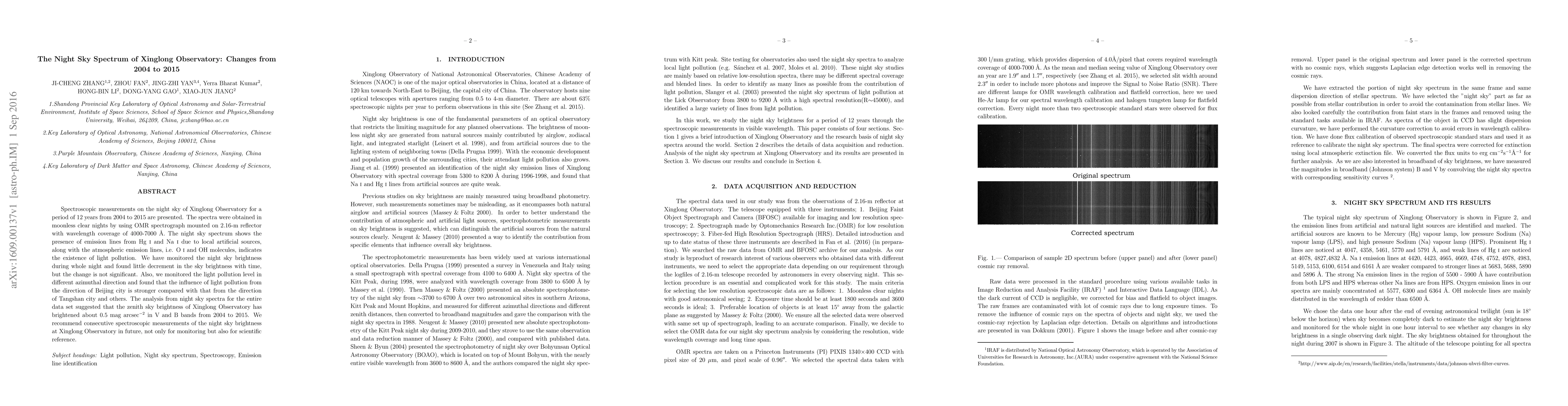 This study presents spectroscopic measurements of the night sky at Xinglong Observatory from 2004 to 2015, revealing light pollution from artificial sources and atmospheric emissions. While the overall sky brightness has slightly decreased over the period, the zenith sky brightness has brightened by about 0.5 mag arcsec^-2 in the V and B bands, with stronger light pollution influence from Beijing.