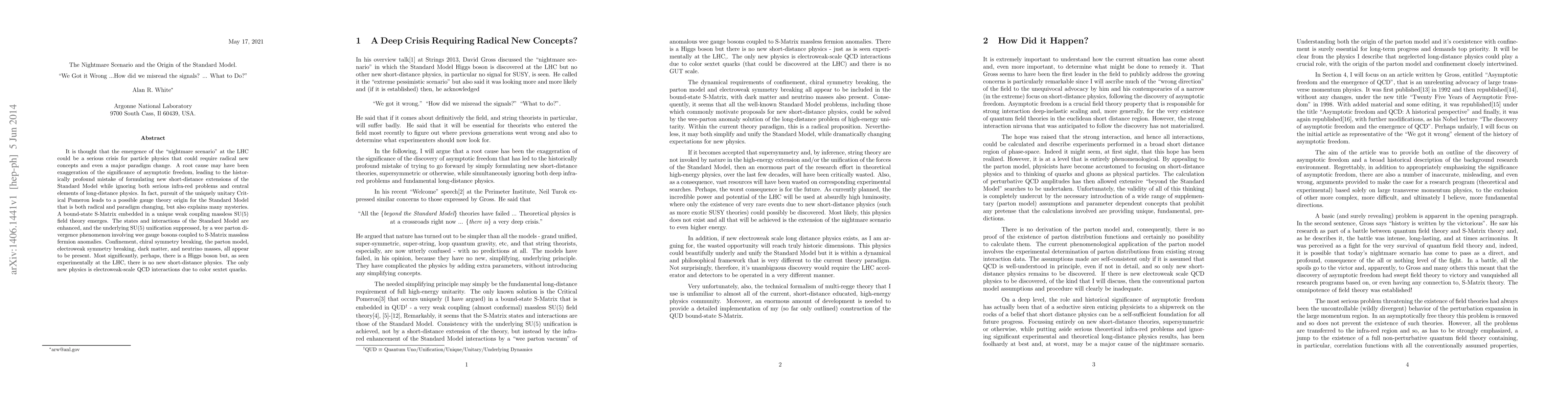 It is thought that the emergence of the "nightmare scenario" at the LHC could be a serious crisis for particle physics that could require radical new concepts and even a major paradigm change. A root cause may have been exaggeration of the significance of asymptotic freedom, leading to the historically profound mistake of formulating new short-distance extensions of the Standard Model while ignoring both serious infra-red problems and central elements of long-distance physics. In fact, pursuit of the uniquely unitary Critical Pomeron leads to a possible gauge theory origin for the Standard Model that is both radical and paradigm changing, but also explains many mysteries. A bound-state S-Matrix embedded in a unique weak coupling massless SU(5) field theory emerges. The states and interactions of the Standard Model are enhanced, and the underlying SU(5) unification suppressed, by a wee parton divergence phenomenon involving wee gauge bosons coupled to S-Matrix massless fermion anomalies. Confinement, chiral symmetry breaking, the parton model, electroweak symmetry breaking, dark matter, and neutrino masses, all appear to be present. Most significantly, perhaps, there is a Higgs boson but, as seen experimentally at the LHC, there is no new short-distance physics. The only new physics is electroweak-scale QCD interactions due to color sextet quarks.