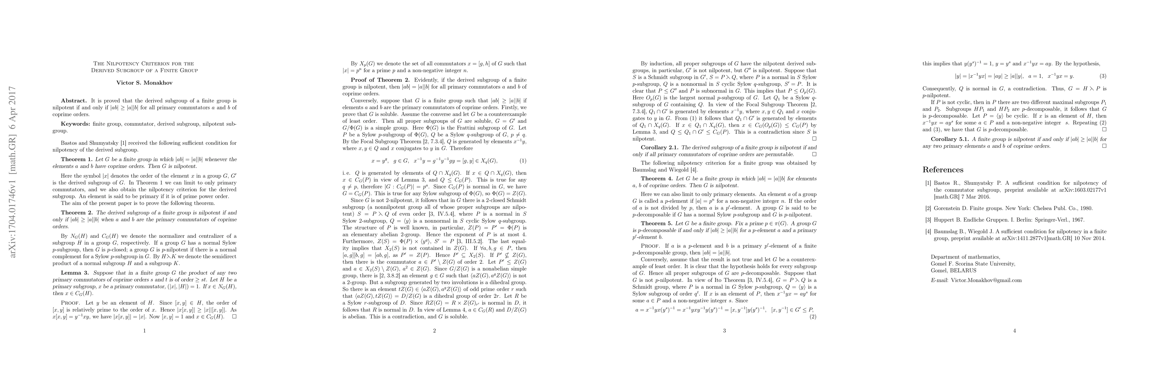 A finite group has a nilpotent derived subgroup if and only if its primary commutators of coprime orders satisfy |ab| >= |a||b|. This condition ensures the derived subgroup is nilpotent.