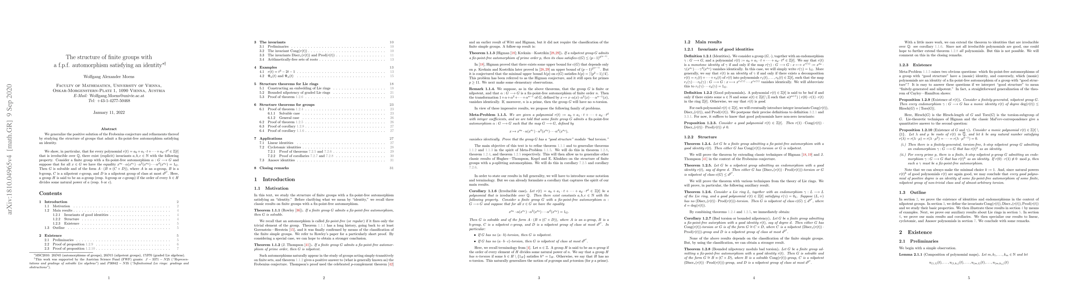 We generalize the positive solution of the Frobenius conjecture and refinements thereof by studying the structure of groups that admit a fix-point-free automorphism satisfying an identity. We show, in particular, that for every polynomial $r(t) = a_0 + a_1 \cdot t + \cdots + a_d \cdot t^d \in \mathbb{Z}[t]$ that is irreducible over $\mathbb{Q}$, there exist (explicit) invariants $a,b,c \in \mathbb{N}$ with the following property. Consider a finite group with a fix-point-free automorphism ${\alpha}:{G}\longrightarrow{G}$ and suppose that for all $x \in G$ we have the equality $x^{a_0} \cdot \alpha(x^{a_1}) \cdot \alpha^2(x^{a_2})\cdots \alpha^d(x^{a_d}) = 1_G.$ Then $G$ is solvable and of the form $A \cdot (B \rtimes (C \times D))$, where $A$ is an $a$-group, $B$ is a $b$-group, $C$ is a nilpotent $c$-group, and $D$ is a nilpotent group of class at most $d^{2^d}$. Here, a group $H$ is said to be an $a$-group (resp. $b$-group or $c$-group) if the order of every $h \in H$ divides some natural power of $a$ (resp. $b$ or $c$).