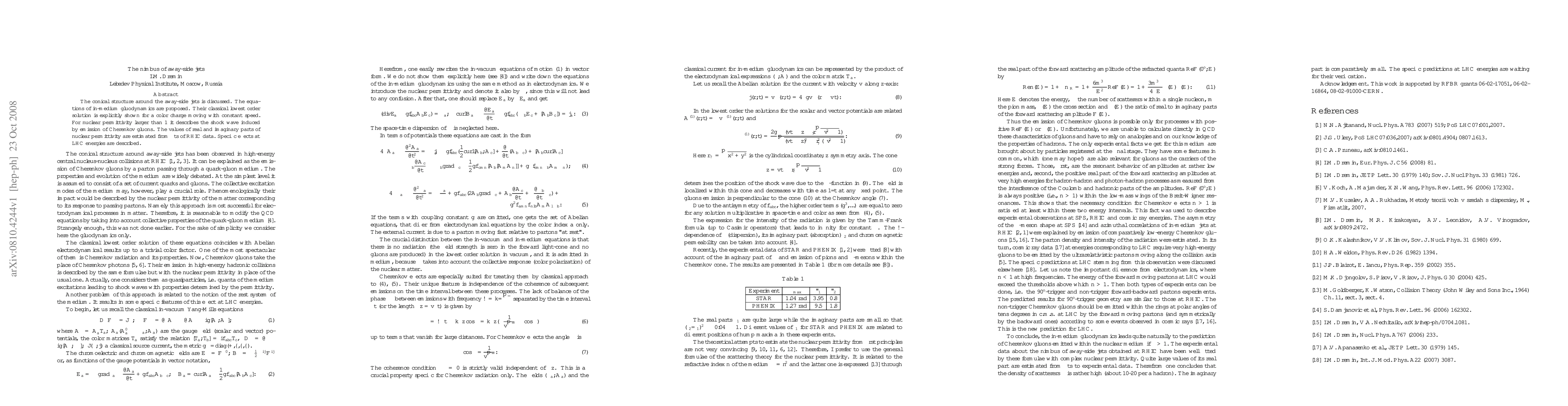 The conical structure around the away-side jets is discussed. The equations of in-medium gluodynamics are proposed. Their classical lowest order solution is explicitly shown for a color charge moving with constant speed. For nuclear permittivity larger than 1 it describes the shock wave induced by emission of Cherenkov gluons. The values of real and imaginary parts of nuclear permittivity are estimated from fits of RHIC data. Specific effects at LHC energies are described.