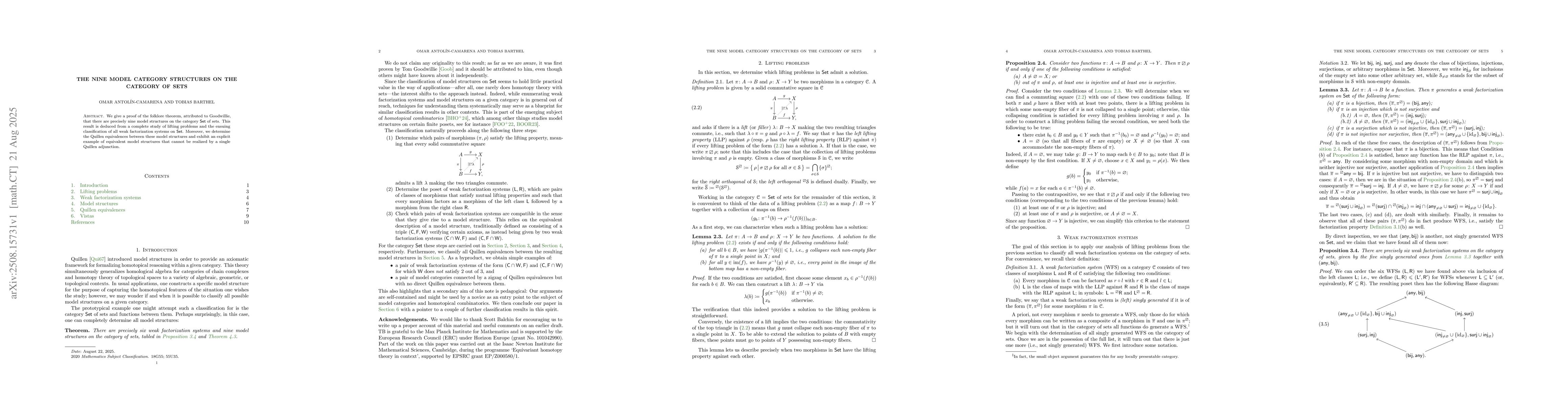 We give a proof of the folklore theorem, attributed to Goodwillie, that there are precisely nine model structures on the category $\mathsf{Set}$ of sets. This result is deduced from a complete study of lifting problems and the ensuing classification of all weak factorization systems on $\mathsf{Set}$. Moreover, we determine the Quillen equivalences between these model structures and exhibit an explicit example of equivalent model structures that cannot be realized by a single Quillen adjunction.