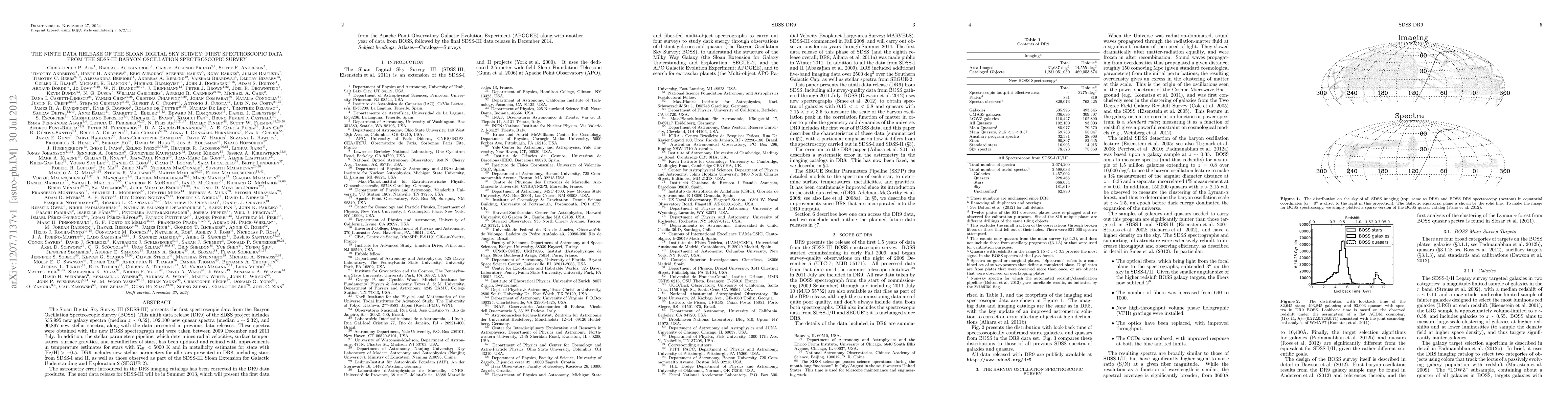 The Sloan Digital Sky Survey III (SDSS-III) releases its ninth data set (DR9), featuring 535,995 new galaxy spectra, 102,100 quasar spectra, and 90,897 stellar spectra, collected with the BOSS spectrograph. The release also includes refined stellar parameters and corrected astrometric errors.