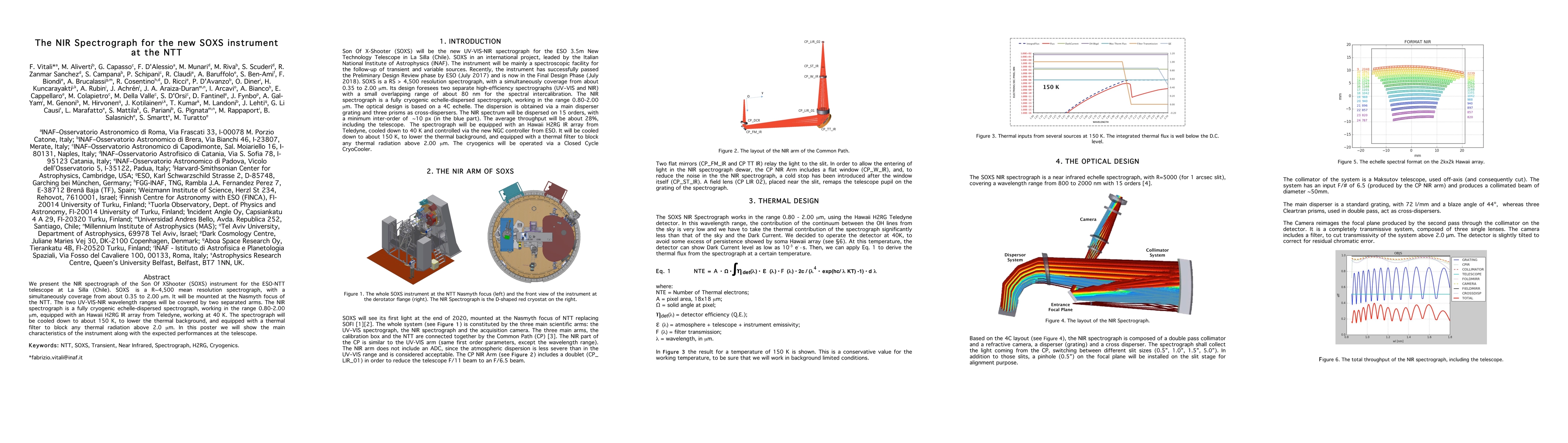 We present the NIR spectrograph of the Son Of XShooter (SOXS) instrument for the ESO-NTT telescope at La Silla (Chile). SOXS is a R~4,500 mean resolution spectrograph, with a simultaneously coverage from about 0.35 to 2.00 {\mu}m. It will be mounted at the Nasmyth focus of the NTT. The two UV-VIS-NIR wavelength ranges will be covered by two separated arms. The NIR spectrograph is a fully cryogenic echelle-dispersed spectrograph, working in the range 0.80-2.00 {\mu}m, equipped with an Hawaii H2RG IR array from Teledyne, working at 40 K. The spectrograph will be cooled down to about 150 K, to lower the thermal background, and equipped with a thermal filter to block any thermal radiation above 2.0 {\mu}m. In this poster we will show the main characteristics of the instrument along with the expected performances at the telescope.