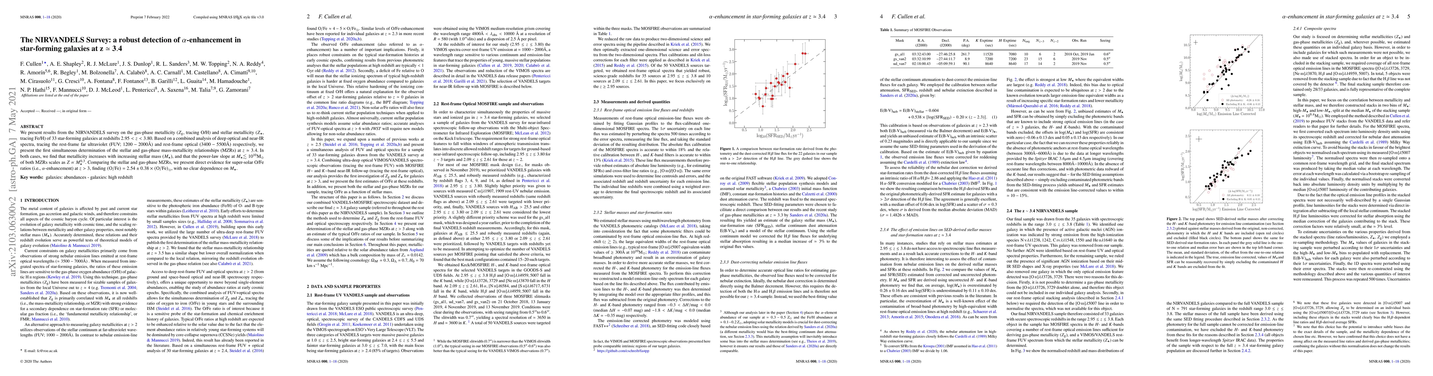 The NIRVANDELS survey reveals $\alpha$-enhancement in star-forming galaxies at $z\simeq3.4$, showing super-solar O/Fe ratios, indicating an $\alpha$-element enrichment independent of stellar mass. The study finds a consistent power-law slope for both stellar and gas-phase mass-metallicity relationships.
