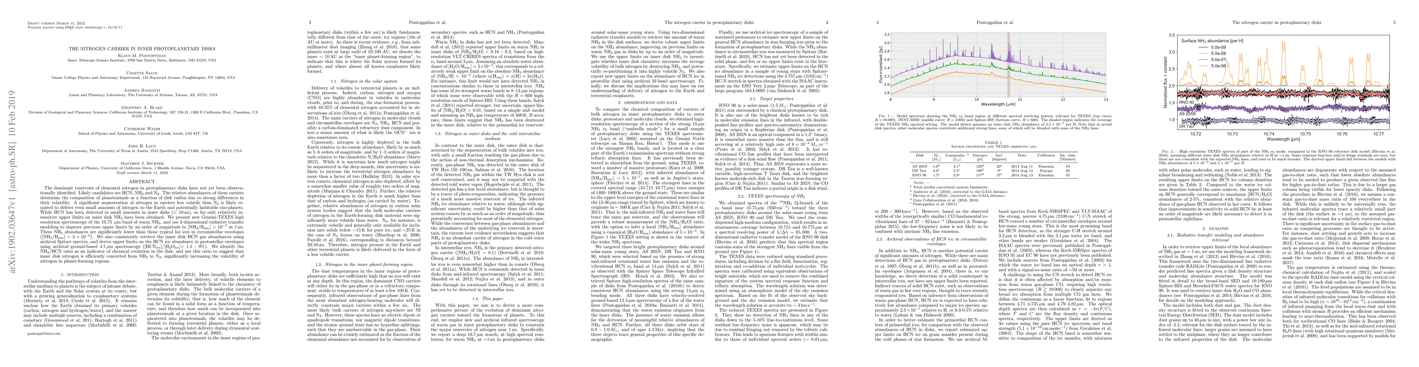 This paper investigates the nitrogen carriers in protoplanetary disks, focusing on HCN, NH$_3$, and N$_2$. Using high-resolution spectroscopy, the study finds NH$_3$ abundances significantly lower than typical circumstellar envelope values, suggesting efficient conversion of NH$_3$ to N$_2$ in inner disks, which impacts nitrogen delivery to forming planets.